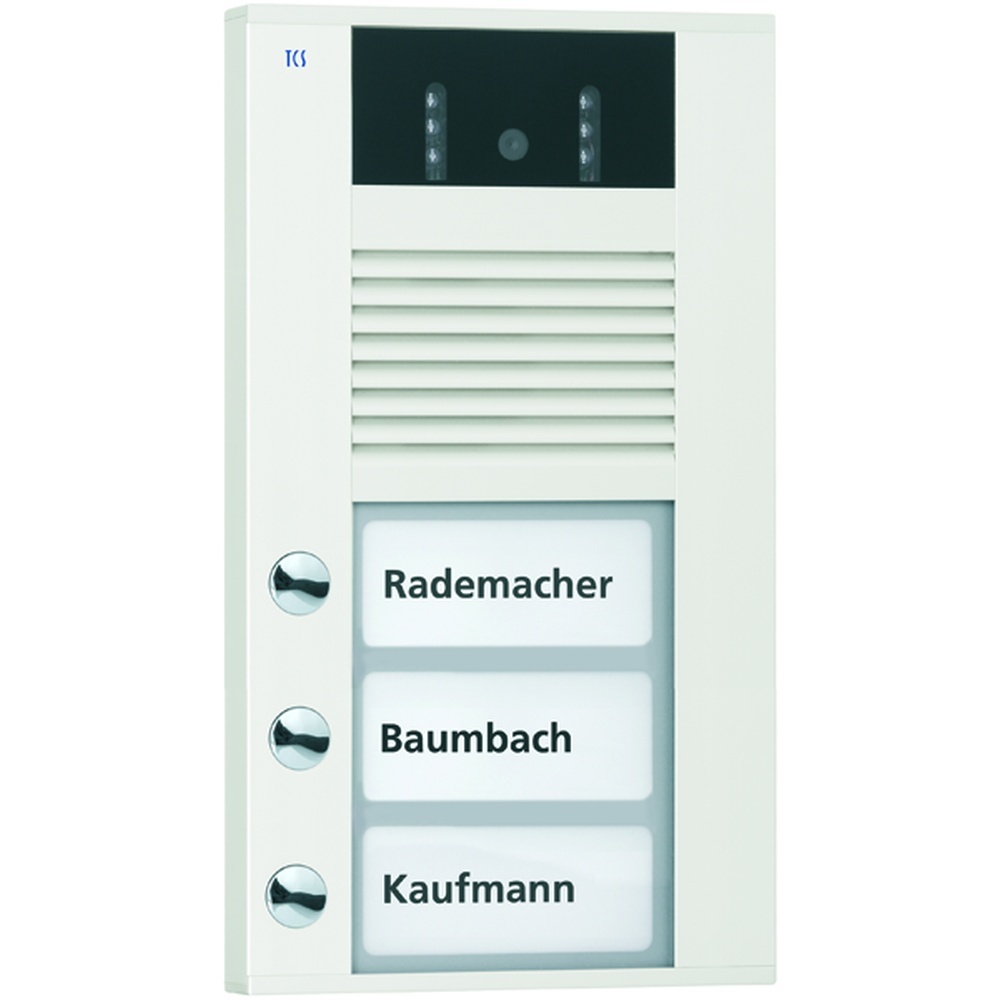 TCS Türstation Video AVD14033-0018 für 3 Wohneinheiten, Kamerafeld: H 38 mmxB 82 mm, color-Kamera CMOS-Sensor 380 TVL, IR-Beleuchtung für Nahfeldausleuchtung, automatische Tag/Nachtumschaltung, Brennweite: f = 2,0 mm (F2,5), Lichtempfindlichkeit 0 Lux (IR ON), 1 Lux (IR OFF), diagonaler Erfassungswinkel in 130 Grad, empfohlene Montagehöhe für die Kameraposition 1,6 m, Videoausgang symmetrisch 1 Vss FBAS, basiert auf dem TCS-Videosystem in 6-Draht-Technik, Eingangsstrom: I(a) = 0,4 mA, I(P) = 60 mA in Ruhe, maximaler Eingangsstrom: I(Pmax) = 80 mA, zulässige Umgebungstemperatur: -20 Grad C bis 50 Grad C, Farbe: Aluminium weiß pulverbeschichtet (WS), Maße: H 242 mmxB 135 mmxT 20 mm Hersteller Typ AVD140330018 EAN Nr. 4035138029056 Warengruppe TCS Außenstation