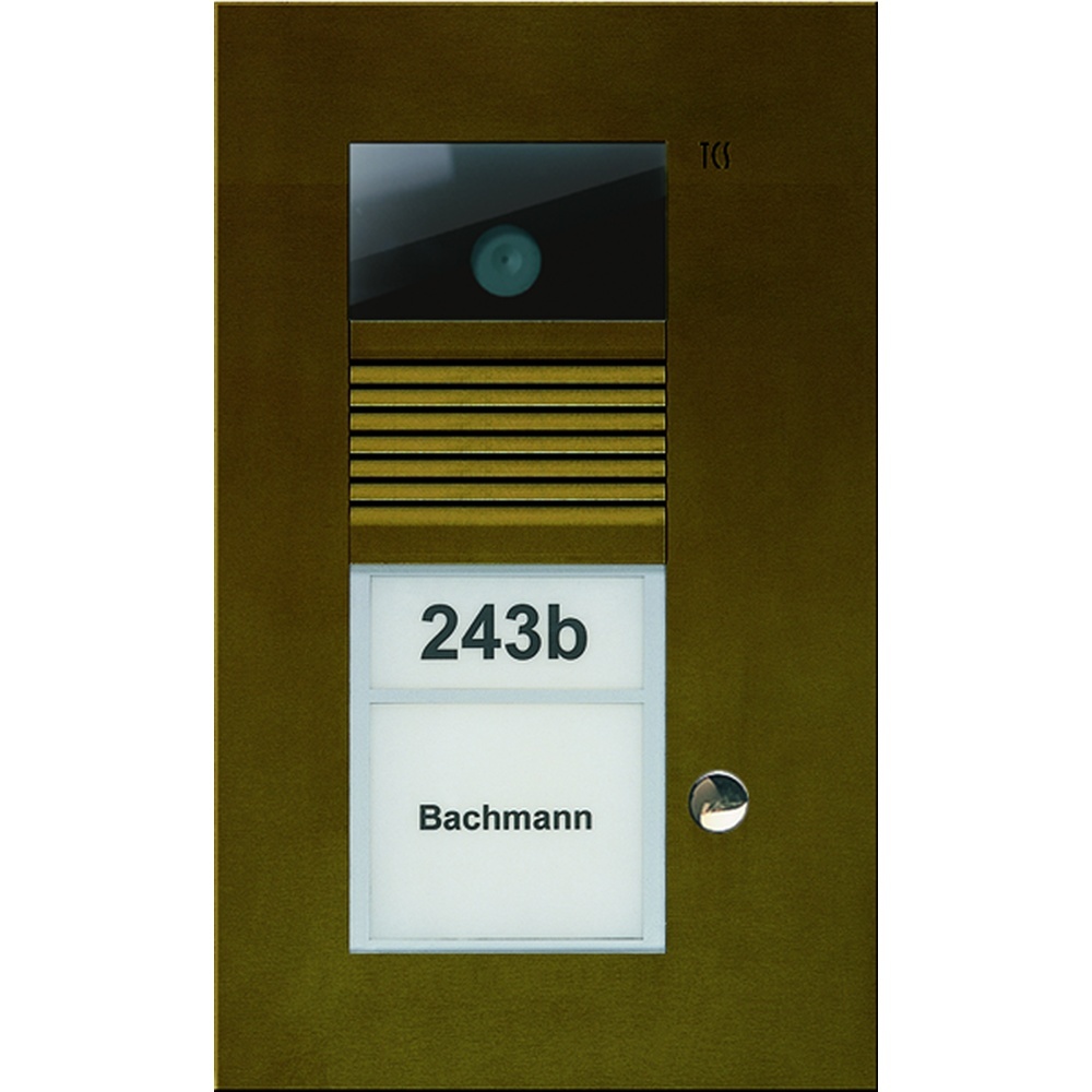 TCS Video Außenstation AVU14010-0012 Video Außenstation Serie AVU mit 1 Klingeltaste (rechtsbündig), 1-spaltig, UP bronze Video-Außenstation zur Unterputzmontage, AVU14010-0012 mit 1 Klingeltaste, 1 Spalte, bronze, Artikelnummer: AVU14010-0012, Bild/VIDEO EIGENSCHAFTEN, Color-Kamera mit Bildsensor 1/4 Single-chip CMOS, diagonaler Erfassungswinkel: 130 Grad, Auflösung, maximal (PixelxPixel): PAL: 648 Hx488 V, Auflösung: 380 H TVL Color, Objektiv 2,0 mm, F=2,5, Lichtempfindlichkeit: 1,0 lx (F 1,2), Videoausgangssignal: (differenziell, koaxial) 1,1 Vp-p., Geräteeigenschaften, Video-Außenstation, Anzahl Klingeltasten: 1, Montageform: Unterputzmontage, Gehäuseform: Frontplatte mit Unterputzkasten, Material Gehäuse: Aluminium, Farbe Gehäuse: eloxiert bronze, Material Klingeltasten: Metall mit wartungsfreien, Kontakten, bruchsicheres Namenschildglas, energiersparende LED-Namensschildbeleuchtung, Öffnungsprinzip: win:clip, Lautstärke Sprachausgabe: einstellbar, Lautstärke Mikrofonempfindlichkeit: einstellbar, Erweiterte Eigenschaften, Lichtschaltfunktion: an jeder Klingeltaste, Namens-/Informationsfeld: weiß hinterleuchtet, Anzahl Drähte: 6-Draht notwendig, Installationsmix Audio, Video, Zutritt in einer Anlage: möglich, Konfigurationsmöglichkeiten: manuell, mit Servicegerät, mit Konfigurationssoftware, Speicher Anlagenkonfiguration: tauschbar gesteckt, Technische Daten, Technologie: 2-Draht-TCS:BUS, Stromaufnahme, in Ruhe: 140 mA, Stromaufnahme, maximal: 156 mA, Frontplatte HxBxT mm: 252x150x3, UP-Kasten HxBxT mm: 203x126x40, Kamerafeld HxB mm: 40x72, Namensschild HxB mm: 26x62, Informationsschild HxB mm: 37x62, zulässige Umgebungstemperatur: -20 bis +50 Grad C, UV-Beständigkeit: uneingeschränkt, empfohlene Montagehöhe: 1,6 m, Lieferumfang, zum Namensschildwechsel: win:clip-Schlüssel, zur Beschriftung: Namensschilder, Zubehör, Hohlwandmontageset für UP-Kästen: ZAU4001 Hersteller TCS Nr. AVU140100012 EAN Nr. 4035138014342 Warengruppe TCS Außenstation