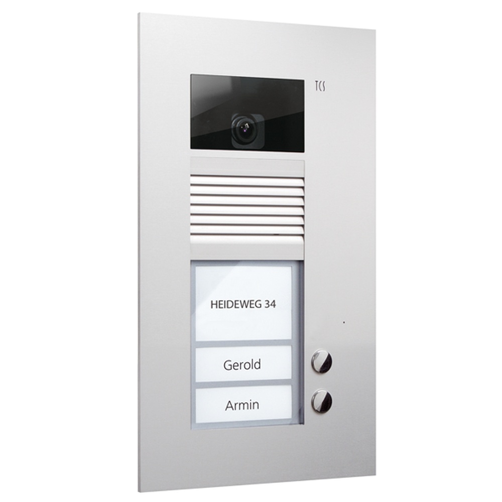 TCS Video Außenstation AVU14020-0010 Video Außenstation Serie AVU mit 2 Klingeltasten (rechtsbündig), 1-spaltig, UP silber Video-Außenstation zur Unterputzmontage, AVU14020-0010 mit 2 Klingeltasten, 1 Spalte, natur, Artikelnummer: AVU14020-0010, Bild/VIDEO EIGENSCHAFTEN, Color-Kamera mit Bildsensor 1/4 Single-chip CMOS, diagonaler Erfassungswinkel: 130 Grad, Auflösung, maximal (PixelxPixel): PAL: 648 Hx488 V, Auflösung: 380 H TVL Color, Objektiv 2,0 mm, F=2,5, Lichtempfindlichkeit: 1,0 lx (F 1,2), Videoausgangssignal: (differenziell, koaxial) 1,1 Vp-p., Geräteeigenschaften, Video-Außenstation, Anzahl Klingeltasten: 2, Montageform: Unterputzmontage, Gehäuseform: Frontplatte mit Unterputzkasten, Material Gehäuse: Aluminium, Farbe Gehäuse: eloxiert natur, Material Klingeltasten: Metall mit wartungsfreien, Kontakten, bruchsicheres Namenschildglas, energiesparende LED-Namensschildbeleuchtung, Öffnungsprinzip: win:clip, Lautstärke Sprachausgabe: einstellbar, Lautstärke Mikrofonempfindlichkeit: einstellbar, Erweiterte Eigenschaften, Lichtschaltfunktion: an jeder Klingeltaste, Namens-/Informationsfeld: weiß hinterleuchtet, Anzahl Drähte: 6-Draht notwendig, Installationsmix Audio, Video, Zutritt in einer Anlage: möglich, Konfigurationsmöglichkeiten: manuell, mit Servicegerät, mit Konfigurationssoftware, Speicher Anlagenkonfiguration: tauschbar gesteckt, Technische Daten, Technologie: 2-Draht-TCS:BUS, Stromaufnahme, in Ruhe: 140 mA, Stromaufnahme, maximal: 156 mA, Frontplatte HxBxT mm: 252x150x3, UP-Kasten HxBxT mm: 203x126x40, Kamerafeld HxB mm: 40x72, Namensschild HxB mm: 19x62, Informationsschild HxB mm: 24x62, zulässige Umgebungstemperatur: -20 bis +50 Grad C, UV-Beständigkeit: uneingeschränkt, empfohlene Montagehöhe: 1,6 m, Lieferumfang, zum Namensschildwechsel: win:clip-Schlüssel, zur Beschriftung: Namensschilder, Zubehör, Hohlwandmontageset für UP-Kästen: ZAU4001 Hersteller TCS Nr. AVU140200010 EAN Nr. 4035138011327 Warengruppe TCS Außenstation