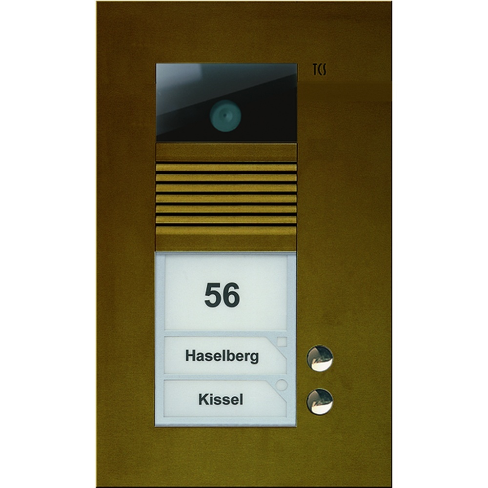 TCS Video Außenstation AVU14020-0012 Video Außenstation Serie AVU mit 2 Klingeltasten (rechtsbündig), 1-spaltig, UP bronze Video-Außenstation zur Unterputzmontage, AVU14020-0012 mit 2 Klingeltasten, 1 Spalte, bronze, Artikelnummer: AVU14020-0012, Bild/VIDEO EIGENSCHAFTEN, Color-Kamera mit Bildsensor 1/4 Single-chip CMOS, diagonaler Erfassungswinkel: 130 Grad, Auflösung, maximal (PixelxPixel): PAL: 648 Hx488 V, Auflösung: 380 H TVL Color, Objektiv 2,0 mm, F=2,5, Lichtempfindlichkeit: 1,0 lx (F 1,2), Videoausgangssignal: (differenziell, koaxial) 1,1 Vp-p., Geräteeigenschaften, Video-Außenstation, Anzahl Klingeltasten: 2, Montageform: Unterputzmontage, Gehäuseform: Frontplatte mit Unterputzkasten, Material Gehäuse: Aluminium, Farbe Gehäuse: eloxiert bronze, Material Klingeltasten: Metall mit wartungsfreien, Kontakten, bruchsicheres Namenschildglas, energiersparende LED-Namensschildbeleuchtung, Öffnungsprinzip: win:clip, Lautstärke Sprachausgabe: einstellbar, Lautstärke Mikrofonempfindlichkeit: einstellbar, Erweiterte Eigenschaften, Lichtschaltfunktion: an jeder Klingeltaste, Namens-/Informationsfeld: weiß hinterleuchtet, Anzahl Drähte: 6-Draht notwendig, Installationsmix Audio, Video, Zutritt in einer Anlage: möglich, Konfigurationsmöglichkeiten: manuell, mit Servicegerät, mit Konfigurationssoftware, Speicher Anlagenkonfiguration: tauschbar gesteckt, Technische Daten, Technologie: 2-Draht-TCS:BUS, Stromaufnahme, in Ruhe: 140 mA, Stromaufnahme, maximal: 156 mA, Frontplatte HxBxT mm: 252x150x3, UP-Kasten HxBxT mm: 203x126x40, Kamerafeld HxB mm: 40x72, Namensschild HxB mm: 19x62, Informationsschild HxB mm: 24x62, zulässige Umgebungstemperatur: -20 bis +50 Grad C, UV-Beständigkeit: uneingeschränkt, empfohlene Montagehöhe: 1,6 m, Lieferumfang, zum Namensschildwechsel: win:clip-Schlüssel, zur Beschriftung: Namensschilder, Zubehör, Hohlwandmontageset für UP-Kästen: ZAU4001 Hersteller TCS Nr. AVU140200012 EAN Nr. 4035138014359 Warengruppe TCS Außenstation
