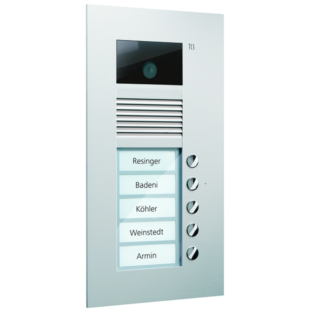 TCS Video Außenstation AVU14050-0010 Video Außenstation Serie AVU mit 5 Klingeltasten (rechtsbündig), 1-spaltig, UP silber Video-Außenstation zur Unterputzmontage, AVU14050-0010 mit 5 Klingeltasten, 1 Spalte, natur, Artikelnummer: AVU14050-0010, Bild/VIDEO EIGENSCHAFTEN, Color-Kamera mit Bildsensor 1/4 Single-chip CMOS, diagonaler Erfassungswinkel: 130 Grad, Auflösung, maximal (PixelxPixel): PAL: 648 Hx488 V, Auflösung: 380 H TVL Color, Objektiv 2,0 mm, F=2,5, Lichtempfindlichkeit: 1,0 lx (F 1,2), Videoausgangssignal: (differenziell, koaxial) 1,1 Vp-p., Geräteeigenschaften, Video-Außenstation, Anzahl Klingeltasten: 5, Montageform: Unterputzmontage, Gehäuseform: Frontplatte mit Unterputzkasten, Material Gehäuse: Aluminium, Farbe Gehäuse: eloxiert natur, Material Klingeltasten: Metall mit wartungsfreien, Kontakten, bruchsicheres Namenschildglas, energiesparende LED-Namensschildbeleuchtung, Öffnungsprinzip: win:clip, Lautstärke Sprachausgabe: einstellbar, Lautstärke Mikrofonempfindlichkeit: einstellbar, Erweiterte Eigenschaften, Lichtschaltfunktion: an jeder Klingeltaste, Namens-/Informationsfeld: weiß hinterleuchtet, Anzahl Drähte: 6-Draht notwendig, Installationsmix Audio, Video, Zutritt in einer Anlage: möglich, Konfigurationsmöglichkeiten: manuell, mit Servicegerät, mit Konfigurationssoftware, Speicher Anlagenkonfiguration: tauschbar gesteckt, Technische Daten, Technologie: 2-Draht-TCS:BUS, Stromaufnahme, in Ruhe: 140 mA, Stromaufnahme, maximal: 156 mA, Frontplatte HxBxT mm: 274x150x3, UP-Kasten HxBxT mm: 225x126x40, Kamerafeld HxB mm: 40x72, Namensschild HxB mm: 19x62, zulässige Umgebungstemperatur: -20 bis +50 Grad C, UV-Beständigkeit: uneingeschränkt, empfohlene Montagehöhe: 1,6 m, Lieferumfang, zum Namensschildwechsel: win:clip-Schlüssel, zur Beschriftung: Namensschilder, Zubehör, Hohlwandmontageset für UP-Kästen: ZAU4001 Hersteller TCS Nr. AVU140500010 EAN Nr. 4035138011396 Warengruppe TCS Außenstation