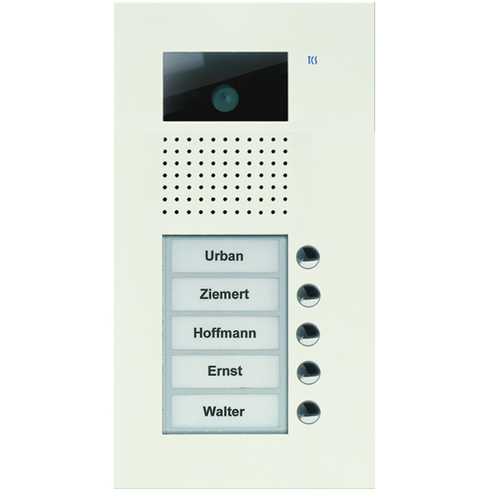 TCS Video Außenstation AVU14050-0019 Video Außenstation Serie AVU mit 5 Klingeltasten (rechtsbündig), 1-spaltig, UP weiß Video-Außenstation zur Unterputzmontage, AVU14050-0019 mit 5 Klingeltasten, 1 Spalte, weiss, Artikelnummer: AVU14050-0019, Bild/VIDEO EIGENSCHAFTEN, Color-Kamera mit Bildsensor 1/4 Single-chip CMOS, diagonaler Erfassungswinkel: 130 Grad, Auflösung, maximal (PixelxPixel): PAL: 648 Hx488 V, Auflösung: 380 H TVL Color, Objektiv 2,0 mm, F=2,5, Lichtempfindlichkeit: 1,0 lx (F 1,2), Videoausgangssignal: (differenziell, koaxial) 1,1 Vp-p., Geräteeigenschaften, Video-Außenstation, Anzahl Klingeltasten: 5, Montageform: Unterputzmontage, Gehäuseform: Frontplatte mit Unterputzkasten, Material Gehäuse: Aluminium, Farbe Gehäuse: weiss beschichtet, Material Klingeltasten: Metall mit wartungsfreien, Kontakten, bruchsicheres Namenschildglas, energiesparende LED-Namensschildbeleuchtung, Öffnungsprinzip: win:clip, Lautstärke Sprachausgabe: einstellbar, Lautstärke Mikrofonempfindlichkeit: einstellbar, Erweiterte Eigenschaften, Lichtschaltfunktion: an jeder Klingeltaste, Namens-/Informationsfeld: weiß hinterleuchtet, Anzahl Drähte: 6-Draht notwendig, Installationsmix Audio, Video, Zutritt in einer Anlage: möglich, Konfigurationsmöglichkeiten: manuell, mit Servicegerät, mit Konfigurationssoftware, Speicher Anlagenkonfiguration: tauschbar gesteckt, Technische Daten, Technologie: 2-Draht-TCS:BUS, Stromaufnahme, in Ruhe: 140 mA, Stromaufnahme, maximal: 156 mA, Frontplatte HxBxT mm: 274x150x3, UP-Kasten HxBxT mm: 225x126x40, Kamerafeld HxB mm: 40x72, Namensschild HxB mm: 19x62, zulässige Umgebungstemperatur: -20 bis +50 Grad C, UV-Beständigkeit: uneingeschränkt, empfohlene Montagehöhe: 1,6 m, Lieferumfang, zum Namensschildwechsel: win:clip-Schlüssel, zur Beschriftung: Namensschilder, Zubehör, Hohlwandmontageset für UP-Kästen: ZAU4001 Hersteller TCS Nr. AVU140500019 EAN Nr. 4035138014205 Warengruppe TCS Außenstation