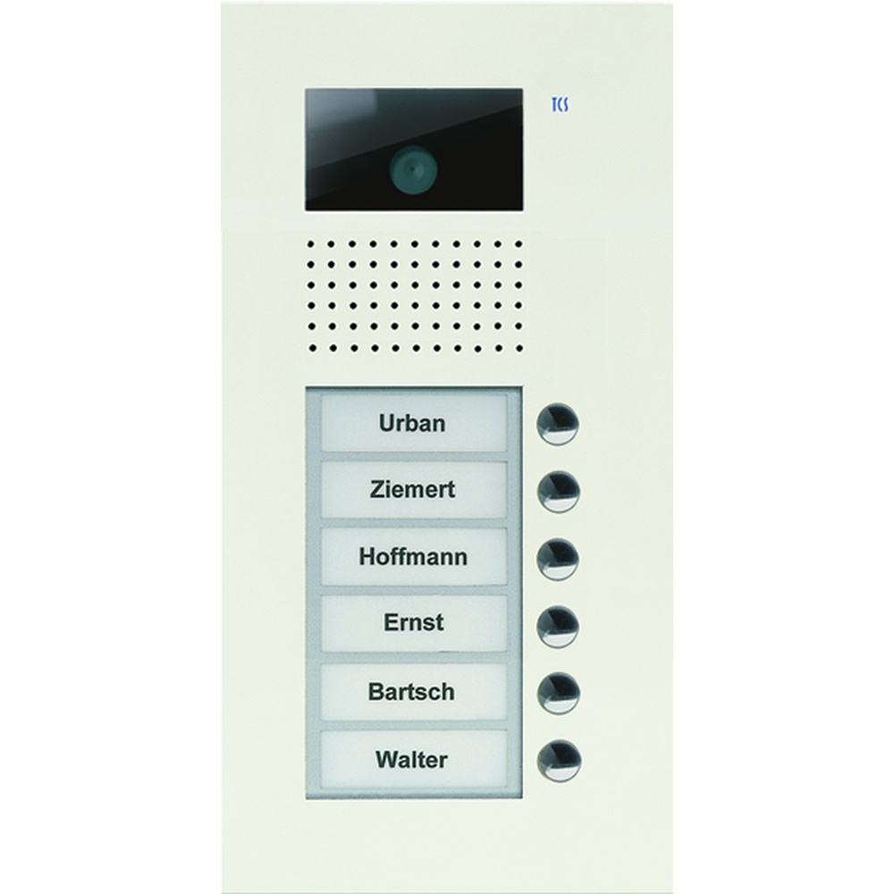 TCS Video Außenstation AVU14060-0019 Video Außenstation Serie AVU mit 6 Klingeltasten (rechtsbündig), 1-spaltig, UP weiß Video-Außenstation zur Unterputzmontage, AVU14060-0019 mit 6 Klingeltasten, 1 Spalte, weiss, Artikelnummer: AVU14060-0019, Bild/VIDEO EIGENSCHAFTEN, Color-Kamera mit Bildsensor 1/4 Single-chip CMOS, diagonaler Erfassungswinkel: 130 Grad, Auflösung, maximal (PixelxPixel): PAL: 648 Hx488 V, Auflösung: 380 H TVL Color, Objektiv 2,0 mm, F=2,5, Lichtempfindlichkeit: 1,0 lx (F 1,2), Videoausgangssignal: (differenziell, koaxial) 1,1 Vp-p., Geräteeigenschaften, Video-Außenstation, Anzahl Klingeltasten: 6, Montageform: Unterputzmontage, Gehäuseform: Frontplatte mit Unterputzkasten, Material Gehäuse: Aluminium, Farbe Gehäuse: weiss beschichtet, Material Klingeltasten: Metall mit wartungsfreien, Kontakten, bruchsicheres Namenschildglas, energiesparende LED-Namensschildbeleuchtung, Öffnungsprinzip: win:clip, Lautstärke Sprachausgabe: einstellbar, Lautstärke Mikrofonempfindlichkeit: einstellbar, Erweiterte Eigenschaften, Lichtschaltfunktion: an jeder Klingeltaste, Namens-/Informationsfeld: weiß hinterleuchtet, Anzahl Drähte: 6-Draht notwendig, Installationsmix Audio, Video, Zutritt in einer Anlage: möglich, Konfigurationsmöglichkeiten: manuell, mit Servicegerät, mit Konfigurationssoftware, Speicher Anlagenkonfiguration: tauschbar gesteckt, Technische Daten, Technologie: 2-Draht-TCS:BUS, Stromaufnahme, in Ruhe: 140 mA, Stromaufnahme, maximal: 156 mA, Frontplatte HxBxT mm: 296x150x3, UP-Kasten HxBxT mm: 247x126x40, Kamerafeld HxB mm: 40x72, Namensschild HxB mm: 19x62, zulässige Umgebungstemperatur: -20 bis +50 Grad C, UV-Beständigkeit: uneingeschränkt, empfohlene Montagehöhe: 1,6 m, Lieferumfang, zum Namensschildwechsel: win:clip-Schlüssel, zur Beschriftung: Namensschilder, Zubehör, Hohlwandmontageset für UP-Kästen: ZAU4001 Hersteller TCS Nr. AVU140600019 EAN Nr. 4035138014212 Warengruppe TCS Außenstation