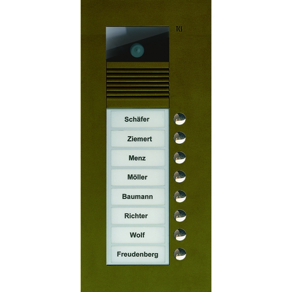 TCS Video Außenstation AVU14080-0012 Video Außenstation Serie AVU mit 8 Klingeltasten (rechtsbündig), 1-spaltig, UP bronze Video-Außenstation zur Unterputzmontage, AVU14080-0012 mit 8 Klingeltasten, 1 Spalte, bronze, Artikelnummer: AVU14080-0012, Bild/VIDEO EIGENSCHAFTEN, Color-Kamera mit Bildsensor 1/4 Single-chip CMOS, diagonaler Erfassungswinkel: 130 Grad, Auflösung, maximal (PixelxPixel): PAL: 648 Hx488 V, Auflösung: 380 H TVL Color, Objektiv 2,0 mm, F=2,5, Lichtempfindlichkeit: 1,0 lx (F 1,2), Videoausgangssignal: (differenziell, koaxial) 1,1 Vp-p., Geräteeigenschaften, Video-Außenstation, Anzahl Klingeltasten: 8, Montageform: Unterputzmontage, Gehäuseform: Frontplatte mit Unterputzkasten, Material Gehäuse: Aluminium, Farbe Gehäuse: eloxiert bronze, Material Klingeltasten: Metall mit wartungsfreien, Kontakten, bruchsicheres Namenschildglas, energiersparende LED-Namensschildbeleuchtung, Öffnungsprinzip: win:clip, Lautstärke Sprachausgabe: einstellbar, Lautstärke Mikrofonempfindlichkeit: einstellbar, Erweiterte Eigenschaften, Lichtschaltfunktion: an jeder Klingeltaste, Namens-/Informationsfeld: weiß hinterleuchtet, Anzahl Drähte: 6-Draht notwendig, Installationsmix Audio, Video, Zutritt in einer Anlage: möglich, Konfigurationsmöglichkeiten: manuell, mit Servicegerät, mit Konfigurationssoftware, Speicher Anlagenkonfiguration: tauschbar gesteckt, Technische Daten, Technologie: 2-Draht-TCS:BUS, Stromaufnahme, in Ruhe: 140 mA, Stromaufnahme, maximal: 156 mA, Frontplatte HxBxT mm: 340x150x3, UP-Kasten HxBxT mm: 291x126x40, Kamerafeld HxB mm: 40x72, Namensschild HxB mm: 19x62, zulässige Umgebungstemperatur: -20 bis +50 Grad C, UV-Beständigkeit: uneingeschränkt, empfohlene Montagehöhe: 1,6 m, Lieferumfang, zum Namensschildwechsel: win:clip-Schlüssel, zur Beschriftung: Namensschilder, Zubehör, Hohlwandmontageset für UP-Kästen: ZAU4001 Hersteller TCS Nr. AVU140800012 EAN Nr. 4035138014410 Warengruppe TCS Außenstation