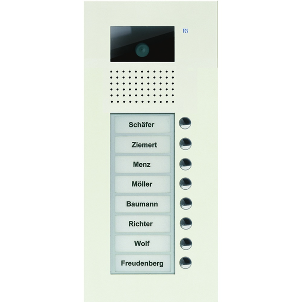 TCS Video Außenstation AVU14080-0019 Video Außenstation Serie AVU mit 8 Klingeltasten (rechtsbündig), 1-spaltig, UP weiß Video-Außenstation zur Unterputzmontage, AVU14080-0019 mit 8 Klingeltasten, 1 Spalte, weiss, Artikelnummer: AVU14080-0019, Bild/VIDEO EIGENSCHAFTEN, Color-Kamera mit Bildsensor 1/4 Single-chip CMOS, diagonaler Erfassungswinkel: 130 Grad, Auflösung, maximal (PixelxPixel): PAL: 648 Hx488 V, Auflösung: 380 H TVL Color, Objektiv 2,0 mm, F=2,5, Lichtempfindlichkeit: 1,0 lx (F 1,2), Videoausgangssignal: (differenziell, koaxial) 1,1 Vp-p., Geräteeigenschaften, Video-Außenstation, Anzahl Klingeltasten: 8, Montageform: Unterputzmontage, Gehäuseform: Frontplatte mit Unterputzkasten, Material Gehäuse: Aluminium, Farbe Gehäuse: weiss beschichtet, Material Klingeltasten: Metall mit wartungsfreien, Kontakten, bruchsicheres Namenschildglas, energiesparende LED-Namensschildbeleuchtung, Öffnungsprinzip: win:clip, Lautstärke Sprachausgabe: einstellbar, Lautstärke Mikrofonempfindlichkeit: einstellbar, Erweiterte Eigenschaften, Lichtschaltfunktion: an jeder Klingeltaste, Namens-/Informationsfeld: weiß hinterleuchtet, Anzahl Drähte: 6-Draht notwendig, Installationsmix Audio, Video, Zutritt in einer Anlage: möglich, Konfigurationsmöglichkeiten: manuell, mit Servicegerät, mit Konfigurationssoftware, Speicher Anlagenkonfiguration: tauschbar gesteckt, Technische Daten, Technologie: 2-Draht-TCS:BUS, Stromaufnahme, in Ruhe: 140 mA, Stromaufnahme, maximal: 156 mA, Frontplatte HxBxT mm: 340x150x3, UP-Kasten HxBxT mm: 291x126x40, Kamerafeld HxB mm: 40x72, Namensschild HxB mm: 19x62, zulässige Umgebungstemperatur: -20 bis +50 Grad C, UV-Beständigkeit: uneingeschränkt, empfohlene Montagehöhe: 1,6 m, Lieferumfang, zum Namensschildwechsel: win:clip-Schlüssel, zur Beschriftung: Namensschilder, Zubehör, Hohlwandmontageset für UP-Kästen: ZAU4001 Hersteller TCS Nr. AVU140800019 EAN Nr. 4035138014236 Warengruppe TCS Außenstation