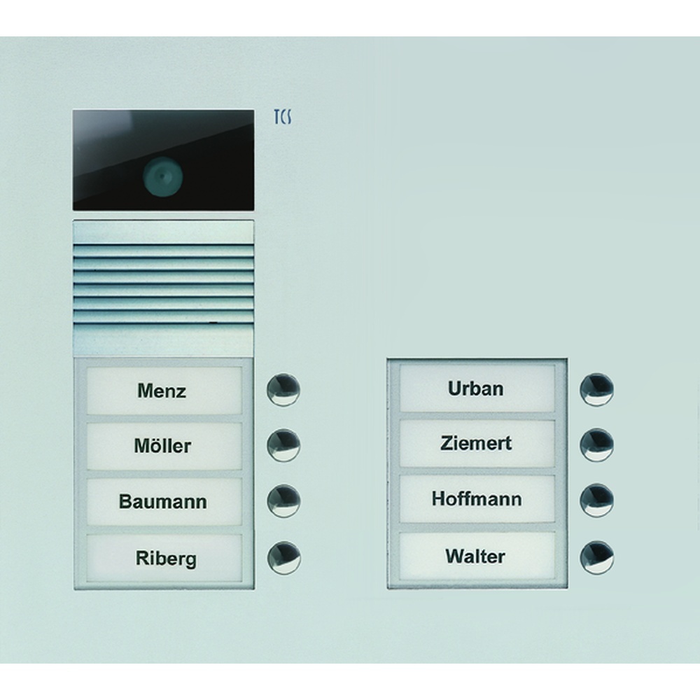 TCS Video Außenstation AVU15080-0010 Video Außenstation Serie AVU mit 8 Klingeltasten (rechtsbündig), 2-spaltig, UP silber Video-Außenstation zur Unterputzmontage, AVU15080-0010, 8 Klingeltasten, 2 Spalten, natur,, Artikelnummer: AVU15080-0010, Bild/VIDEO EIGENSCHAFTEN, Color-Kamera mit Bildsensor 1/4 Single-chip CMOS, diagonaler Erfassungswinkel: 130 Grad, Auflösung, maximal (PixelxPixel): PAL: 648 Hx488 V, Auflösung: 380 H TVL Color, Objektiv 2,0 mm, F=2,5, Lichtempfindlichkeit: 1,0 lx (F 1,2), Videoausgangssignal: (differenziell, koaxial) 1,1 Vp-p., Geräteeigenschaften, Video-Außenstation, Anzahl Klingeltasten: 8, Montageform: Unterputzmontage, Gehäuseform: Frontplatte mit Unterputzkasten, Material Gehäuse: Aluminium, Farbe Gehäuse: eloxiert natur, Material Klingeltasten: Metall mit wartungsfreien, Kontakten, bruchsicheres Namenschildglas, energiesparende LED-Namensschildbeleuchtung, Öffnungsprinzip: win:clip, Lautstärke Sprachausgabe: einstellbar, Lautstärke Mikrofonempfindlichkeit: einstellbar, Erweiterte Eigenschaften, Lichtschaltfunktion: an jeder Klingeltaste, Namens-/Informationsfeld: weiß hinterleuchtet, Anzahl Drähte: 6-Draht notwendig, Installationsmix Audio, Video, Zutritt in einer Anlage: möglich, Konfigurationsmöglichkeiten: manuell, mit Servicegerät, mit Konfigurationssoftware, Speicher Anlagenkonfiguration: tauschbar gesteckt, Technische Daten, Technologie: 2-Draht-TCS:BUS, Stromaufnahme, in Ruhe: 156 mA, Stromaufnahme, maximal: 160 mA, Frontplatte HxBxT mm: 252x274x3, UP-Kasten HxBxT mm: 203x250x40, Kamerafeld HxB mm: 40x72, Namensschild HxB mm: 19x62, zulässige Umgebungstemperatur: -20 bis +50 Grad C, UV-Beständigkeit: uneingeschränkt, empfohlene Montagehöhe: 1,6 m, Lieferumfang, zum Namensschildwechsel: win:clip-Schlüssel, zur Beschriftung: Namensschilder, Zubehör, Hohlwandmontageset für UP-Kästen: ZAU4001 Hersteller TCS Nr. AVU150800010 EAN Nr. 4035138011365 Warengruppe TCS Außenstation