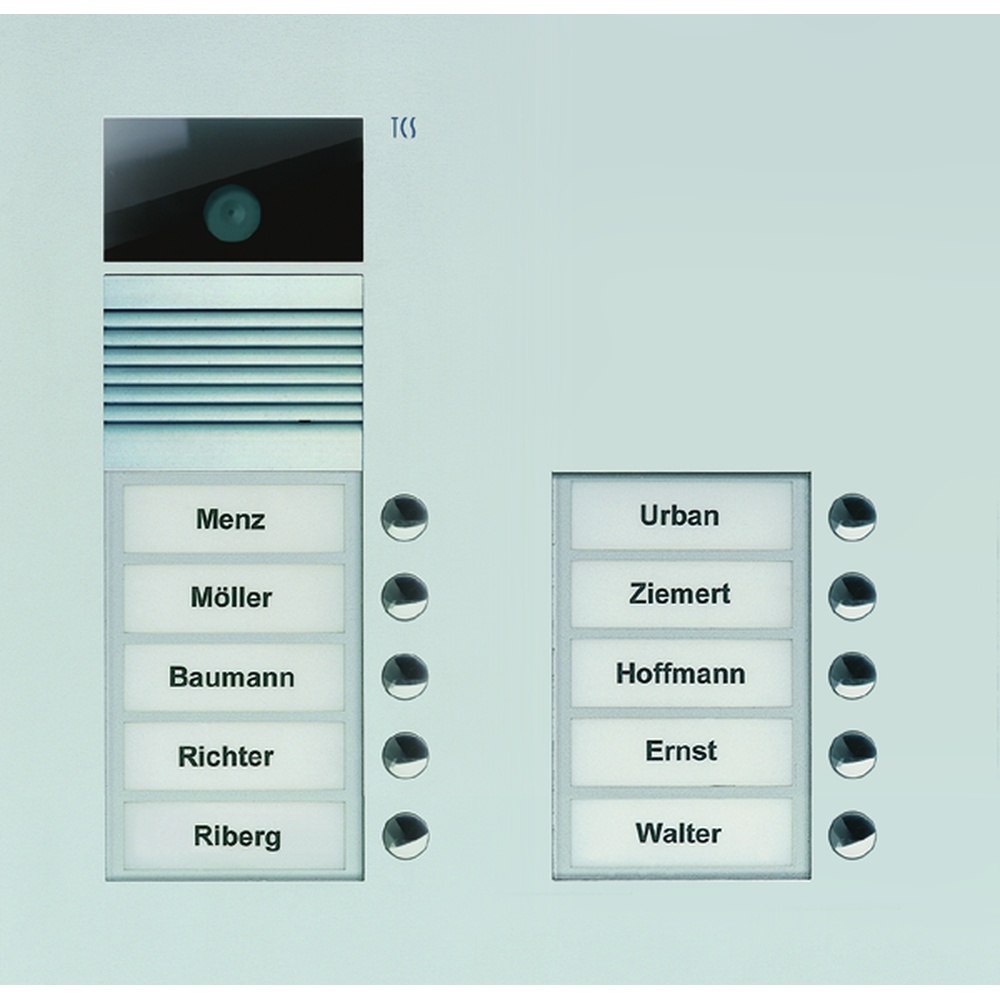 TCS Video Außenstation AVU15100-0010 Video Außenstation Serie AVU mit 10 Klingeltasten (rechtsbündig), 2-spaltig, UP silber Video-Außenstation zur Unterputzmontage, AVU15100-0010, 10 Klingeltasten 2 Spalten, natur, Artikelnummer: AVU15100-0010, Bild/VIDEO EIGENSCHAFTEN, Color-Kamera mit Bildsensor 1/4 Single-chip CMOS, diagonaler Erfassungswinkel: 130 Grad, Auflösung, maximal (PixelxPixel): PAL: 648 Hx488 V, Auflösung: 380 H TVL Color, Objektiv 2,0 mm, F=2,5, Lichtempfindlichkeit: 1,0 lx (F 1,2), Videoausgangssignal: (differenziell, koaxial) 1,1 Vp-p., Geräteeigenschaften, Video-Außenstation, Anzahl Klingeltasten: 10, Montageform: Unterputzmontage, Gehäuseform: Frontplatte mit Unterputzkasten, Material Gehäuse: Aluminium, Farbe Gehäuse: eloxiert natur, Material Klingeltasten: Metall mit wartungsfreien, Kontakten, bruchsicheres Namenschildglas, energiesparende LED-Namensschildbeleuchtung, Öffnungsprinzip: win:clip, Lautstärke Sprachausgabe: einstellbar, Lautstärke Mikrofonempfindlichkeit: einstellbar, Erweiterte Eigenschaften, Lichtschaltfunktion: an jeder Klingeltaste, Namens-/Informationsfeld: weiß hinterleuchtet, Anzahl Drähte: 6-Draht notwendig, Installationsmix Audio, Video, Zutritt in einer Anlage: möglich, Konfigurationsmöglichkeiten: manuell, mit Servicegerät, mit Konfigurationssoftware, Speicher Anlagenkonfiguration: tauschbar gesteckt, Technische Daten, Technologie: 2-Draht-TCS:BUS, Stromaufnahme, in Ruhe: 156 mA, Stromaufnahme, maximal: 160 mA, Frontplatte HxBxT mm: 274x274x3, UP-Kasten HxBxT mm: 225x250x40, Kamerafeld HxB mm: 40x72, Namensschild HxB mm: 19x62, zulässige Umgebungstemperatur: -20 bis +50 Grad C, UV-Beständigkeit: uneingeschränkt, empfohlene Montagehöhe: 1,6 m, Lieferumfang, zum Namensschildwechsel: win:clip-Schlüssel, zur Beschriftung: Namensschilder, Zubehör, Hohlwandmontageset für UP-Kästen: ZAU4001 Hersteller TCS Nr. AVU151000010 EAN Nr. 4035138011372 Warengruppe TCS Außenstation
