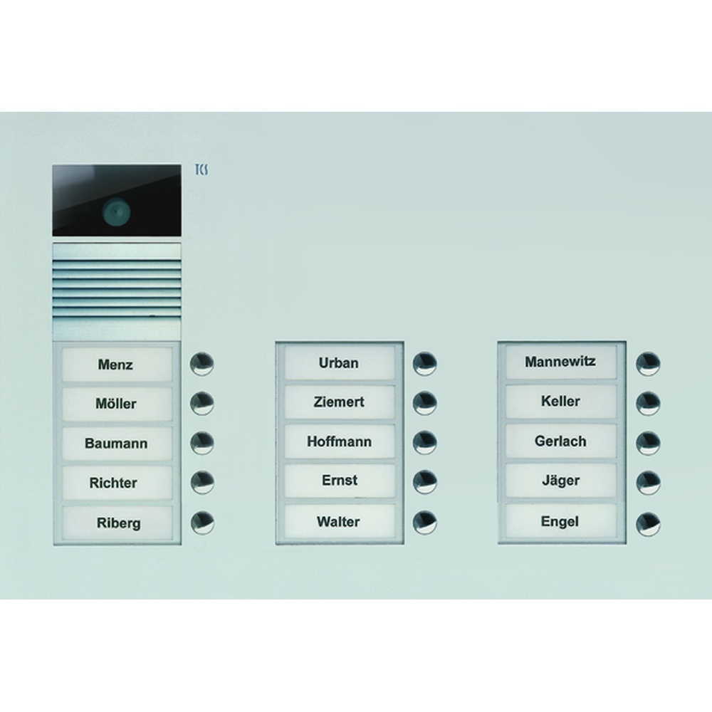 TCS Video Außenstation AVU16150-0010 Video Außenstation Serie AVU mit 15 Klingeltasten (rechtsbündig), 3-spaltig, UP silber Video-Außenstation zur Unterputzmontage, AVU16150-0010, 15 Klingeltasten 3 Spalten, natur, Artikelnummer: AVU16150-0010, Bild/VIDEO EIGENSCHAFTEN, Color-Kamera mit Bildsensor 1/4 Single-chip CMOS, diagonaler Erfassungswinkel: 130 Grad, Auflösung, maximal (PixelxPixel): PAL: 648 Hx488 V, Auflösung: 380 H TVL Color, Objektiv 2,0 mm, F=2,5, Lichtempfindlichkeit: 1,0 lx (F 1,2), Videoausgangssignal: (differenziell, koaxial) 1,1 Vp-p., Geräteeigenschaften, Video-Außenstation, Anzahl Klingeltasten: 15, Montageform: Unterputzmontage, Gehäuseform: Frontplatte mit Unterputzkasten, Material Gehäuse: Aluminium, Farbe Gehäuse: eloxiert natur, Material Klingeltasten: Metall mit wartungsfreien, Kontakten, bruchsicheres Namenschildglas, energiesparende LED-Namensschildbeleuchtung, Öffnungsprinzip: win:clip, Lautstärke Sprachausgabe: einstellbar, Lautstärke Mikrofonempfindlichkeit: einstellbar, Erweiterte Eigenschaften, Lichtschaltfunktion: an jeder Klingeltaste, Namens-/Informationsfeld: weiß hinterleuchtet, Anzahl Drähte: 6-Draht notwendig, Installationsmix Audio, Video, Zutritt in einer Anlage: möglich, Konfigurationsmöglichkeiten: manuell, mit Servicegerät, mit Konfigurationssoftware, Speicher Anlagenkonfiguration: tauschbar gesteckt, Technische Daten, Technologie: 2-Draht-TCS:BUS, Stromaufnahme, in Ruhe: 173 mA, Stromaufnahme, maximal: 178 mA, Frontplatte HxBxT mm: 274x398x3, UP-Kasten HxBxT mm: 225x347x40, Kamerafeld HxB mm: 40x72, Namensschild HxB mm: 19x62, zulässige Umgebungstemperatur: -20 bis +50 Grad C, UV-Beständigkeit: uneingeschränkt, empfohlene Montagehöhe: 1,6 m, Lieferumfang, zum Namensschildwechsel: win:clip-Schlüssel, zur Beschriftung: Namensschilder, Zubehör, Hohlwandmontageset für UP-Kästen: ZAU4001 Hersteller TCS Nr. AVU161500010 EAN Nr. 4035138011488 Warengruppe TCS Außenstation