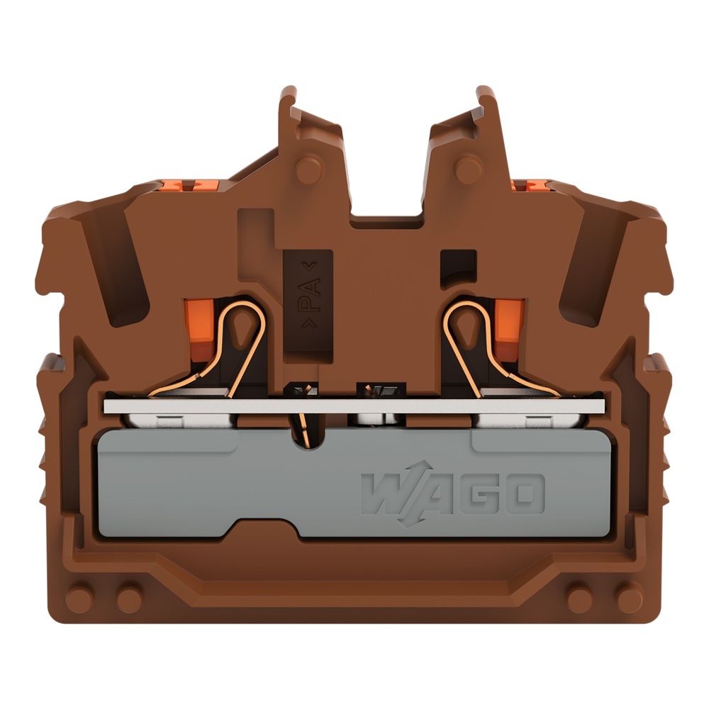 Wago 2Leiter Mini Durchgangsklemme 2252-321/000-014 2-Leiter-Mini-Durchgangsklemme, mit Drücker, 2,5 mm², Mittelklemme ohne Rastfuß, ohne Flansch, seitliche und mittige Beschriftung, mit Prüföffnung, Push-in CAGE CLAMP, 2,50 mm², braun Hersteller Wago Klemmen EAN Nr. 4066966310818 Warengruppe WAGO Miniklemmen