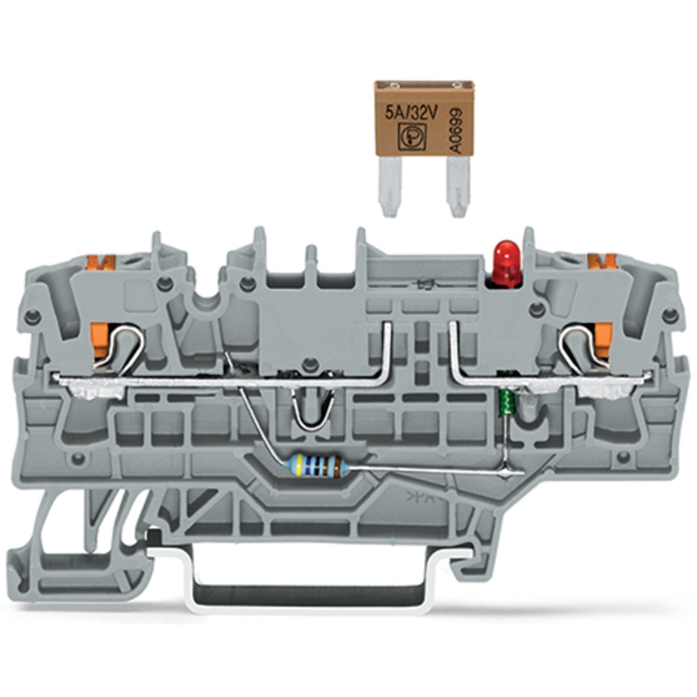 Wago 2Leiter Sicherungsklemme 2202-1981/1000-434 2-Leiter-Sicherungsklemme, für Kfz-Mini-Flachsicherungen, mit Prüfmöglichkeit, mit Drücker, mit Defektanzeige durch LED, 24 V, für Tragschiene 35x15 und 35x7,5, 2,5 mm², Push-in CAGE CLAMP, 2,50 mm², grau Hersteller Wago Klemmen EAN Nr. 4066966083040 Warengruppe WAGO Reihenklemmen