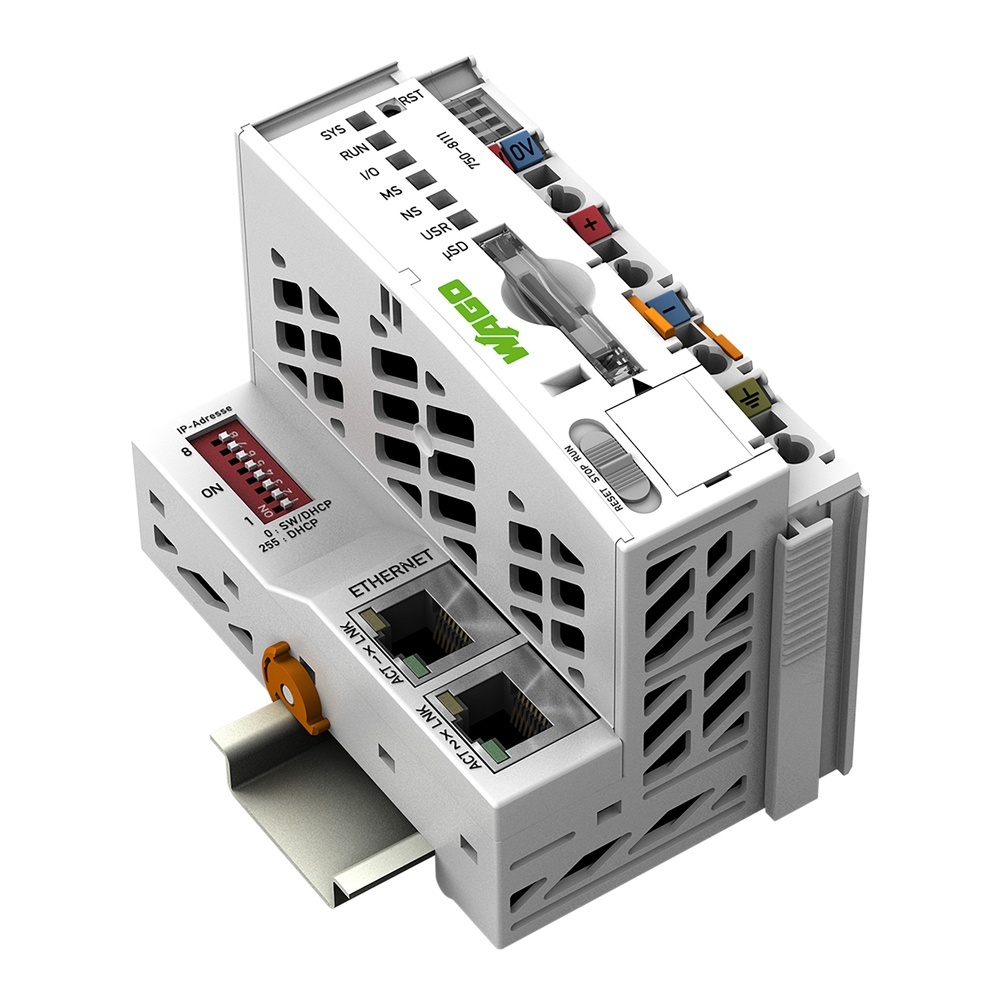 Wago Controller 750-8111 Controller PFC100,2. Generation,2xETHERNET Controller PFC100, 2. Generation, 2xETHERNETDer Controller PFC100 ist eine kompakte Steuerung an dem modularen WAGO I/O System. Neben den Netzwerk- und Feldbusschnittstellen unterstützt er digitale und analoge Module sowie Sondermodule der Serien 750/753.Die zwei ETHERNET-Schnittstellen und der integrierte Switch ermöglichen die Verdrahtung in Linientopologie.Ein integrierter Webserver stellt dem Benutzer Konfigurationsmöglichkeiten und Statusinformationen über den PFC100 zur Verfügung.Typische Anwendungen finden sich für den PFC100 neben der Prozessindustrie und der Gebäudeautomatisierung im Bereich des klassischen Maschinen- und Anlagenbaus, wie beispielsweise in Verpackungs-, Abfüll-, Textil-, Fertigungs-, Metall- und Holzverarbeitungsmaschinen oder -anlagen.Mit dem DIP-Schalter kann das letzte Byte der IP-Adresse sowie der Bezug der IP-Adresse vorgegeben werden.Programmierbar gemäß IEC 61131-3 Programmierbar mit CODESYS V3.5 Direkter Anschluss von WAGO-I/O-Modulen 2xETHERNET (konfigurierbar) Betriebssystem Linux mit RT-Preemption-Patch Konfiguration mit CODESYS, Ethernet Settings oder Web-Based-Management-Oberfläche Wartungsfrei Hersteller Wago Nr. 7508111 EAN Nr. 4066966460858 Warengruppe WAGO I/O System