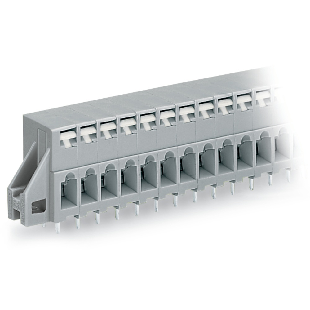 Wago Durchführungsklemmenleiste 741-140 Durchführungsklemmenleiste mit Befestigungsflanschen und Betätigungsdrückern 2 Lötstifte/Pol 10-polig mit Tipp-Prüfmöglichkeit Rastermaß 5 mm/0.197 in grau Wago Serie 741 EAN Nr. 4044918679411 Warengruppe WAGO Durchführungsklemmen