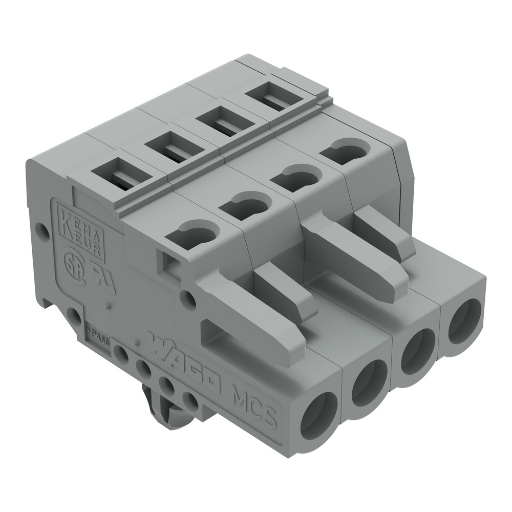 Wago Federleiste 231-104/008-000 Federleiste mit Rastfuß 4-polig Rastermaß 5 mm/0.197 in kodierbar mit 2 Rastklinken Blechdicke 0,6x1,2 mm Befestigungslöcher Ø 3,5 mm mit Montageadapter 209-137 auch auf TS 35 mit Kodiernase mit Rastnase grau Wago Serie 231 EAN Nr. 4044918338295 Warengruppe WAGO Multistecksystem