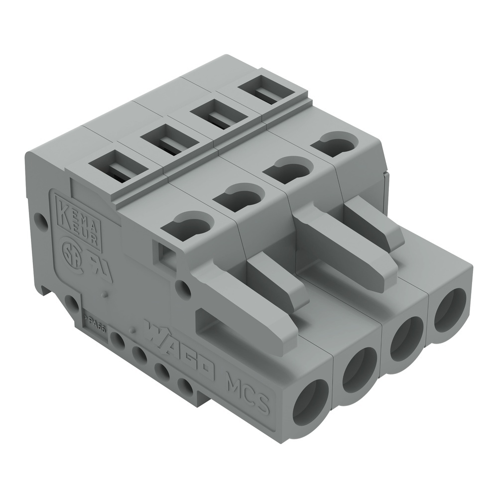Wago Federleiste 231-104/102-000 Federleiste mit integrierter Abschlussplatte 4-polig Rastermaß 5 mm/0.197 in kodierbar mit 2 Rastklinken mit Kodiernase mit Rastnase grau Wago Serie 231 EAN Nr. 4044918338745 Warengruppe WAGO Multistecksystem