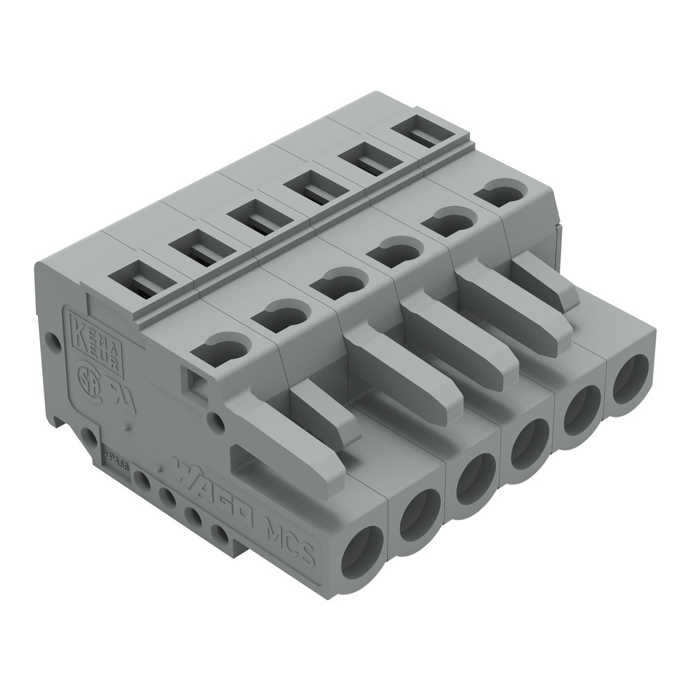 Wago Federleiste 231-106/102-000 Federleiste mit integrierter Abschlussplatte 6-polig Rastermaß 5 mm/0.197 in kodierbar mit 2 Rastklinken mit Kodiernase mit Rastnase grau Wago Serie 231 EAN Nr. 4044918339605 Warengruppe WAGO Multistecksystem
