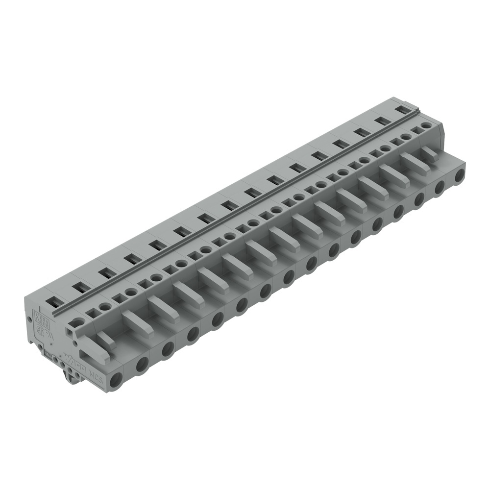 Wago Federleiste 231-216/008-000 Federleiste mit Rastfüßen 16-polig Rastermaß 7,5 mm/0.295 in kodierbar mit 2 Rastklinken Blechdicke 0,6x1,2 mm Befestigungslöcher Ø 3,5 mm mit Montageadapter 209-137 auch auf TS 35 grau Hersteller WAGO Serie 231 EAN Nr. 4044918374965 Warengruppe WAGO Multistecksystem