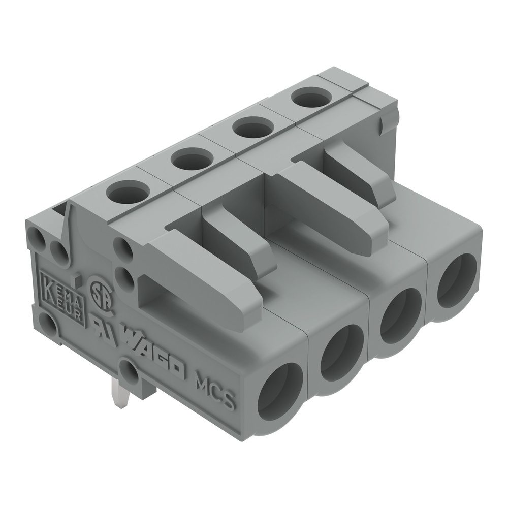 Wago Federleiste 232-234 Federleiste mit abgewinkelten Lötstiften 4-polig Rastermaß 5 mm/0.197 in Einlötstift 0,6x1 mm kodierbar Steckrichtung parallel zur Leiterplatte mit 2 Rastklinken mit Kodiernase mit Rastnase grau Wago Serie 232 EAN Nr. 4044918579124 Warengruppe WAGO Multistecksystem