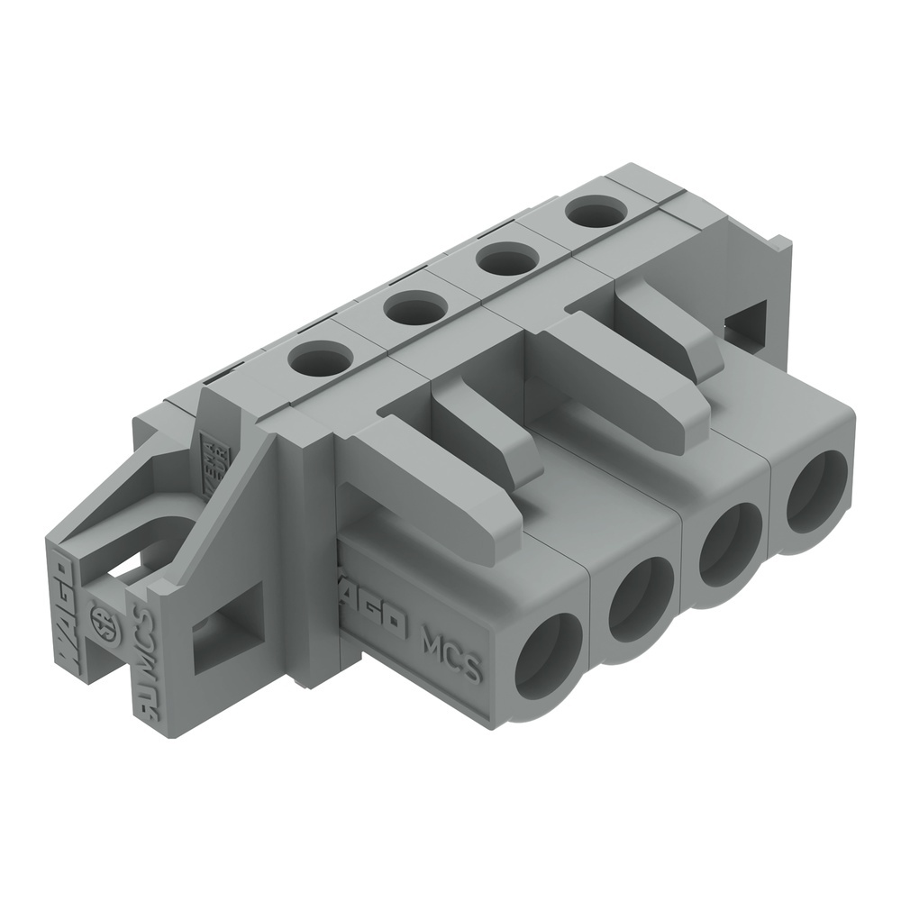 Wago Federleiste 232-234/031-000 Federleiste mit abgewinkelten Lötstiften und Durchführungsflanschen 4-polig Rastermaß 5 mm/0.197 in Einlötstift 0,6x1 mm kodierbar Steckrichtung parallel zur Leiterplatte mit 2 Rastklinken für durchgeführte Montage grau Wago Serie 232 EAN Nr. 4044918624596 Warengruppe WAGO Multistecksystem