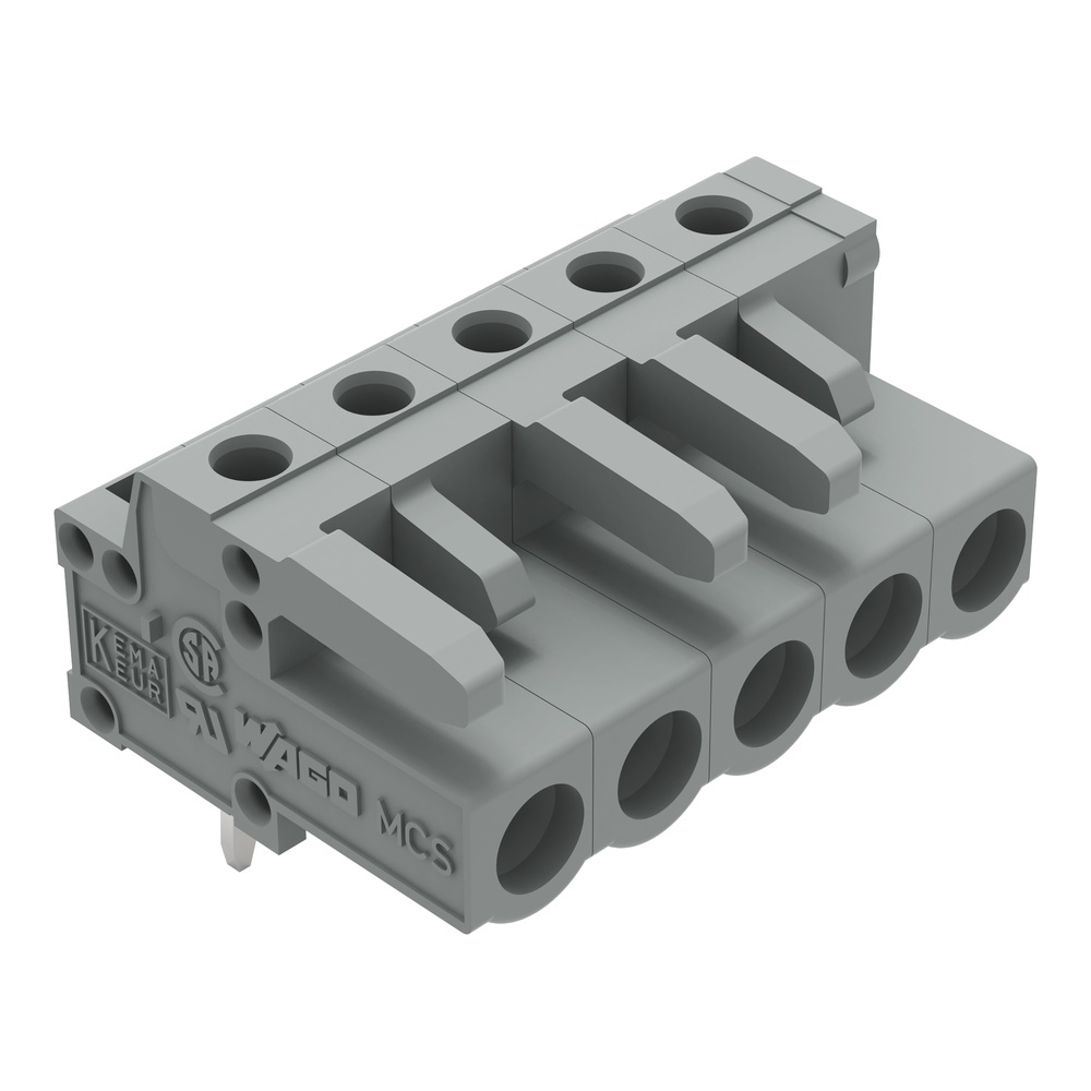 Wago Federleiste 232-235 Federleiste mit abgewinkelten Lötstiften 5-polig Rastermaß 5 mm/0.197 in Einlötstift 0,6x1 mm kodierbar Steckrichtung parallel zur Leiterplatte mit 2 Rastklinken mit Kodiernase mit Rastnase grau Wago Serie 232 EAN Nr. 4044918579148 Warengruppe WAGO Multistecksystem