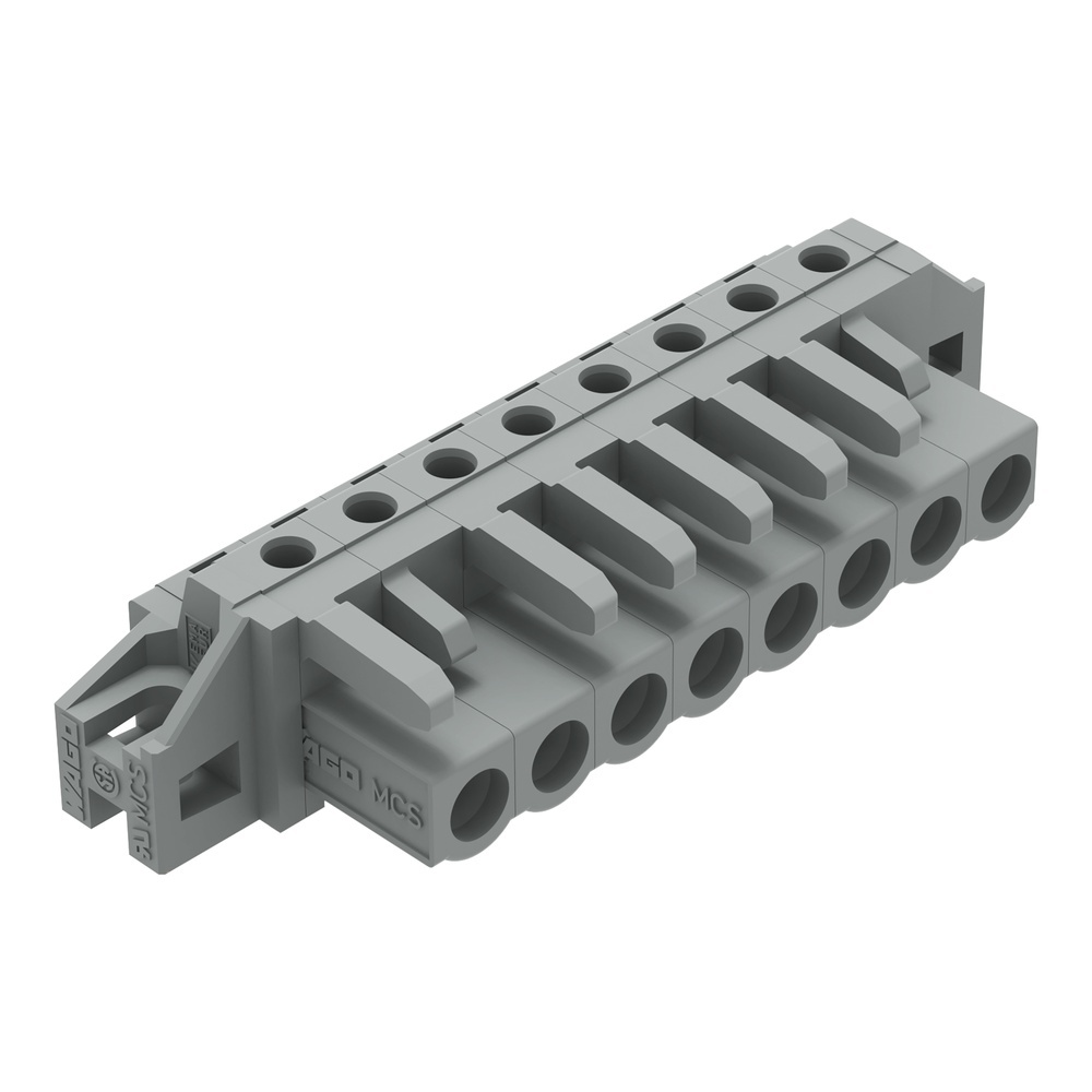 Wago Federleiste 232-238/031-000 Federleiste mit abgewinkelten Lötstiften und Durchführungsflanschen 8-polig Rastermaß 5 mm/0.197 in Einlötstift 0,6x1 mm kodierbar Steckrichtung parallel zur Leiterplatte mit 2 Rastklinken für durchgeführte Montage grau Wago Serie 232 EAN Nr. 4044918624879 Warengruppe WAGO Multistecksystem