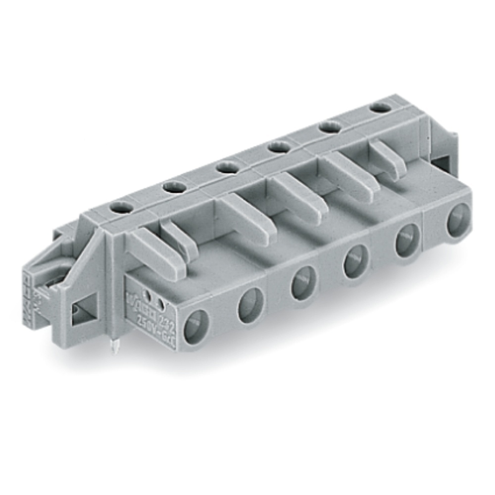 Wago Federleiste 232-840/031-000 Federleiste mit abgewinkelten Lötstiften und Durchführungsflanschen 10-polig Rastermaß 7,5 mm/0.295 in Einlötstift 0,6x1 mm kodierbar Steckrichtung parallel zur Leiterplatte mit 2 Rastklinken für durchgeführte Montage grau Wago Serie 232 EAN Nr. 4044918626491 Warengruppe WAGO Multistecksystem