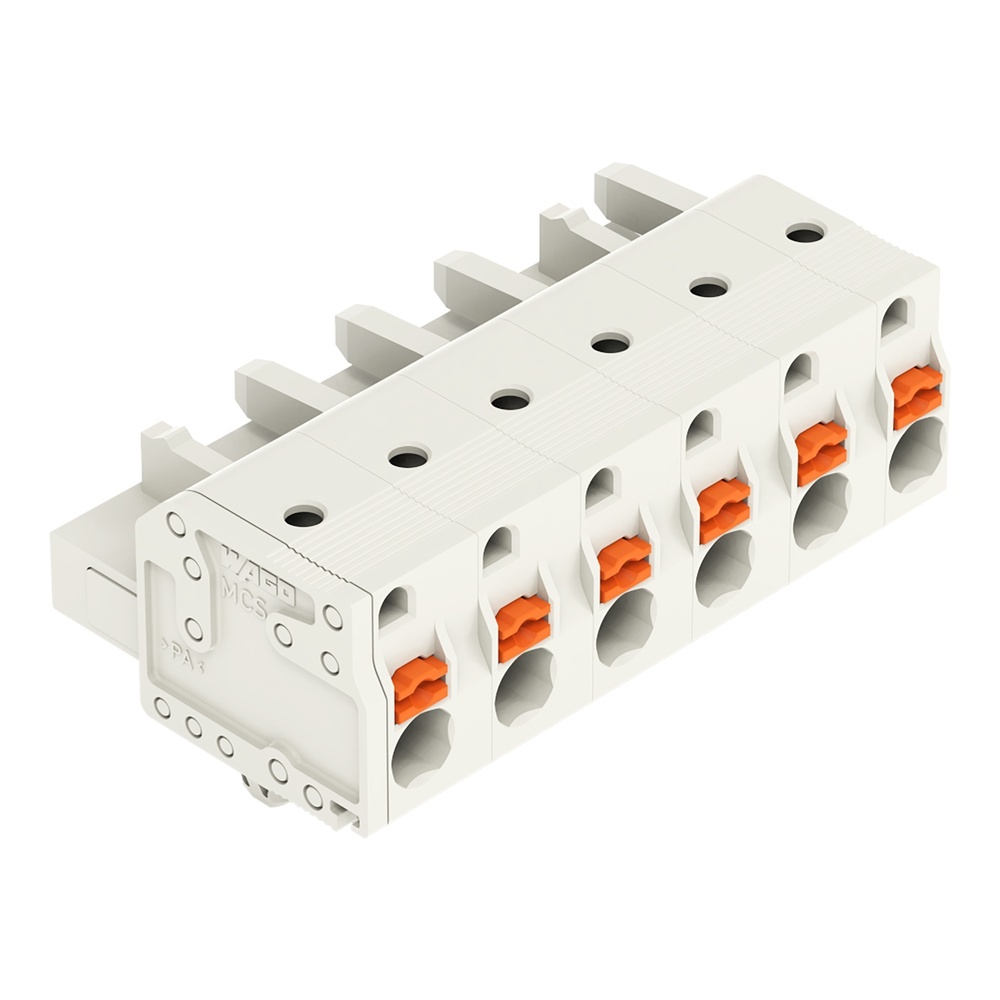Wago Federleiste 2721-206/008-000 Federleiste mit Betätigungsdrückern und Rastfüßen 6-polig Rastermaß 7,5 mm/0.295 in 100 % fehlsteckgeschützt kodierbar mit 2 Rastnasen mit Montageadapter 209-137 auch auf TS 35 Blechdicke 0,6x1,2 mm Befestigungslöcher Ø 3,5 mm lichtgrau Wago Serie 2721 EAN Nr. 4045454745073 Warengruppe WAGO Multistecksystem
