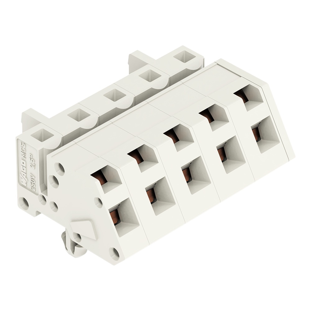 Wago Federleiste 721-335/008-000 Abgewinkelte Federleiste mit Rastfüßen 5-polig Rastermaß 7,5 mm/0.295 in 100 % fehlsteckgeschützt für Oberflächenmontage Blechdicke 0,6x1,2 mm Befestigungslöcher Ø 3,5 mm lichtgrau Wago Serie 721 EAN Nr. 4044918576062 Warengruppe WAGO Multistecksystem