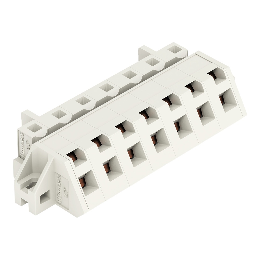 Wago Federleiste 721-337/031-000 Abgewinkelte Federleiste mit Befestigungsflanschen 7-polig Rastermaß 7,5 mm/0.295 in 100 % fehlsteckgeschützt für Oberflächenmontage für Schraub- o.ä. Befestigungsarten lichtgrau Wago Serie 721 EAN Nr. 4017332747714 Warengruppe WAGO Multistecksystem