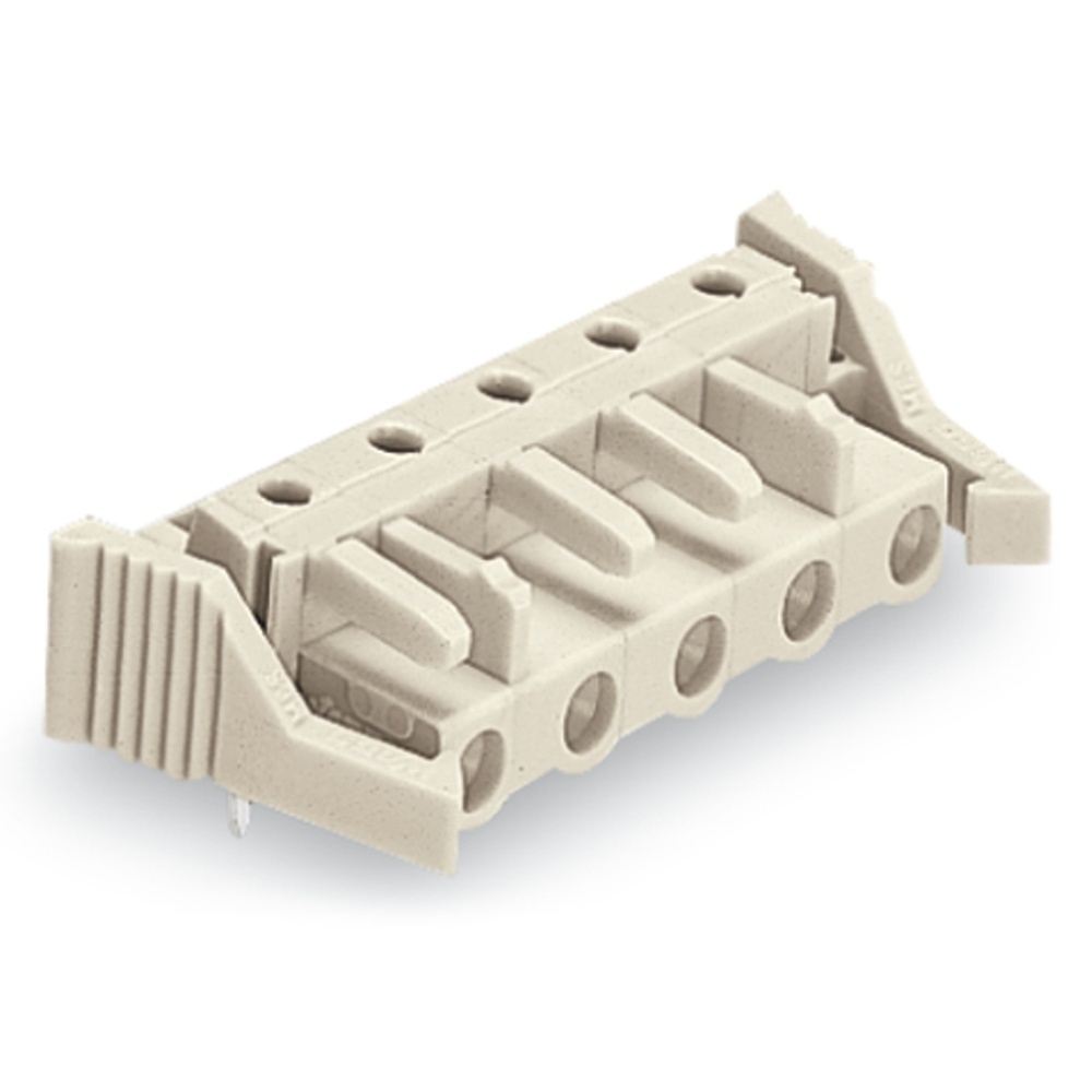 Wago Federleiste 722-838/039-000 Federleiste mit abgewinkelten Lötstiften und Verriegelungsklinken 8-polig Rastermaß 7,5 mm/0.295 in 100 % fehlsteckgeschützt Einlötstift 0,6x1 mm kodierbar Steckrichtung parallel zur Leiterplatte mit 2 Rastnasen lichtgrau Wago Serie 722 EAN Nr. 4050821074236 Warengruppe WAGO Multistecksystem