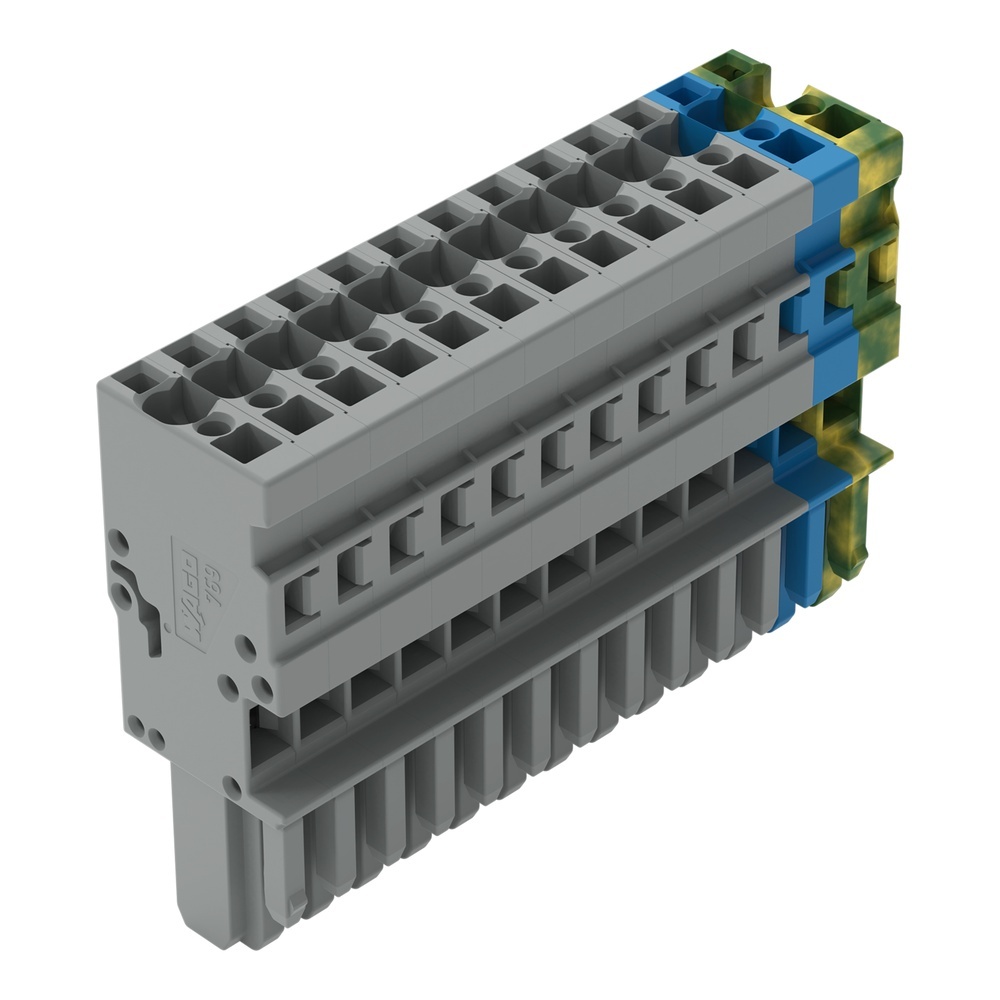 Wago Federleiste 769-113/000-038 1-Leiter-Federleiste mit PE-Anfangsmodul (grün-gelb) zum Einstecken in Basisklemmen oder Stiftleisten kodierbar brückbar mit Mini-Querbrückern 13-polig grau, blau, grün-gelb Hersteller WAGO Serie 769 EAN Nr. 4050821653554 Warengruppe WAGOxCOM System