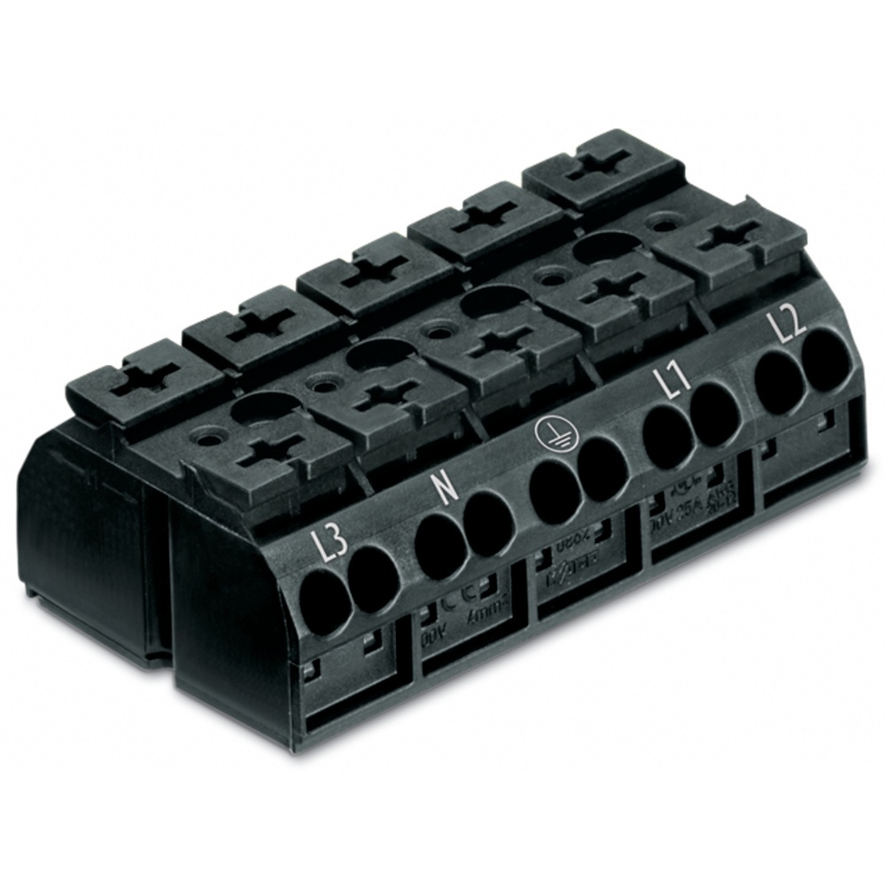 Wago Geräteanschlussklemme 862-2525 4-Leiter-Geräteanschlussklemme 1 Rastfuß an Pos. 2+4 L3-N-PE-L1-L2 ohne PE-Kontakt 5-polig schwarz Hersteller WAGO Serie 862 EAN Nr. 4044918509985 Warengruppe WAGO Miniklemmen