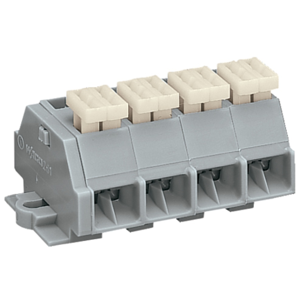 Wago Klemmenleiste 261-204/332-000 4-Leiter-Klemmenleiste einseitig mit Betätigungsdrückern mit Befestigungsflanschen für Schraub- u.ä. Befestigungsarten Befestigungsloch Ø 3,2 mm mit Montagefuß 209-123 auch auf TS 35 4-polig grau Wago Serie 261 EAN Nr. 4044918612692 Warengruppe WAGO Miniklemmen