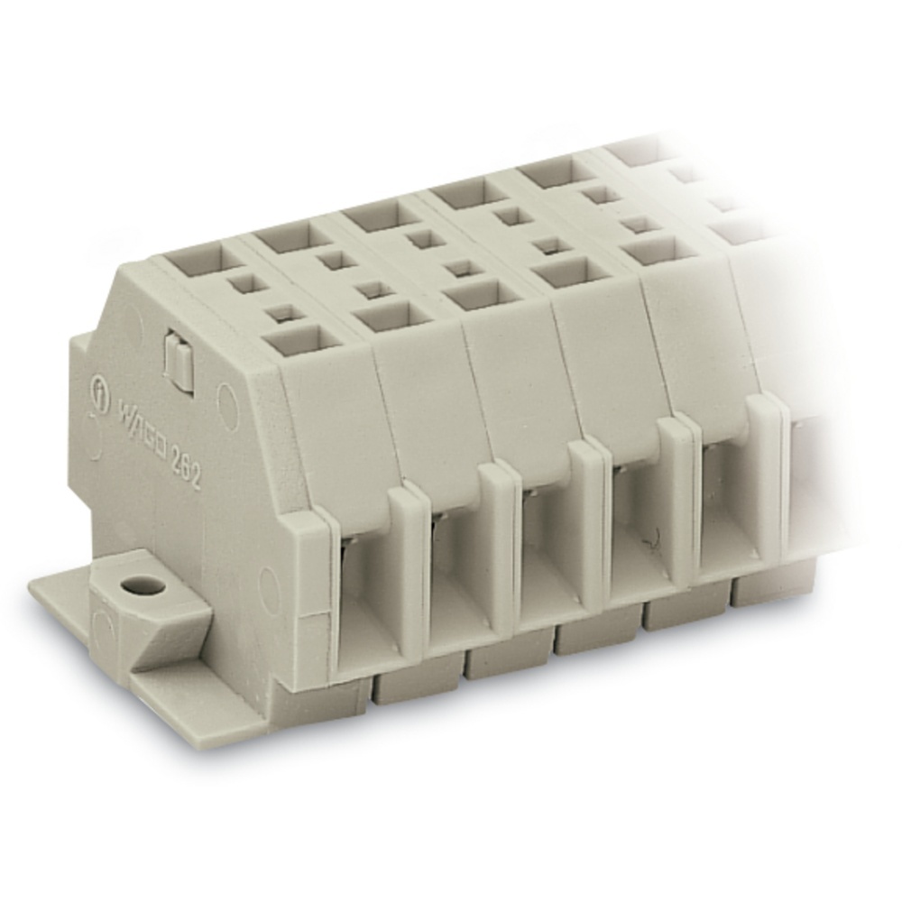 Wago Klemmenleiste 262-185 2-Leiter-Klemmenleiste Ex e II mit Rastfüßen für Blechdicke 0,6-1,2 mm Befestigungsloch Ø 3,5 mm auch auf Alu-Schiene 210-154 oder mit Montagefuß 209-120 auf TS 35 für Anwendungen Ex e II geeignet 5-polig lichtgrau Wago Serie 262 EAN Nr. 4044918642040 Warengruppe WAGO Miniklemmen