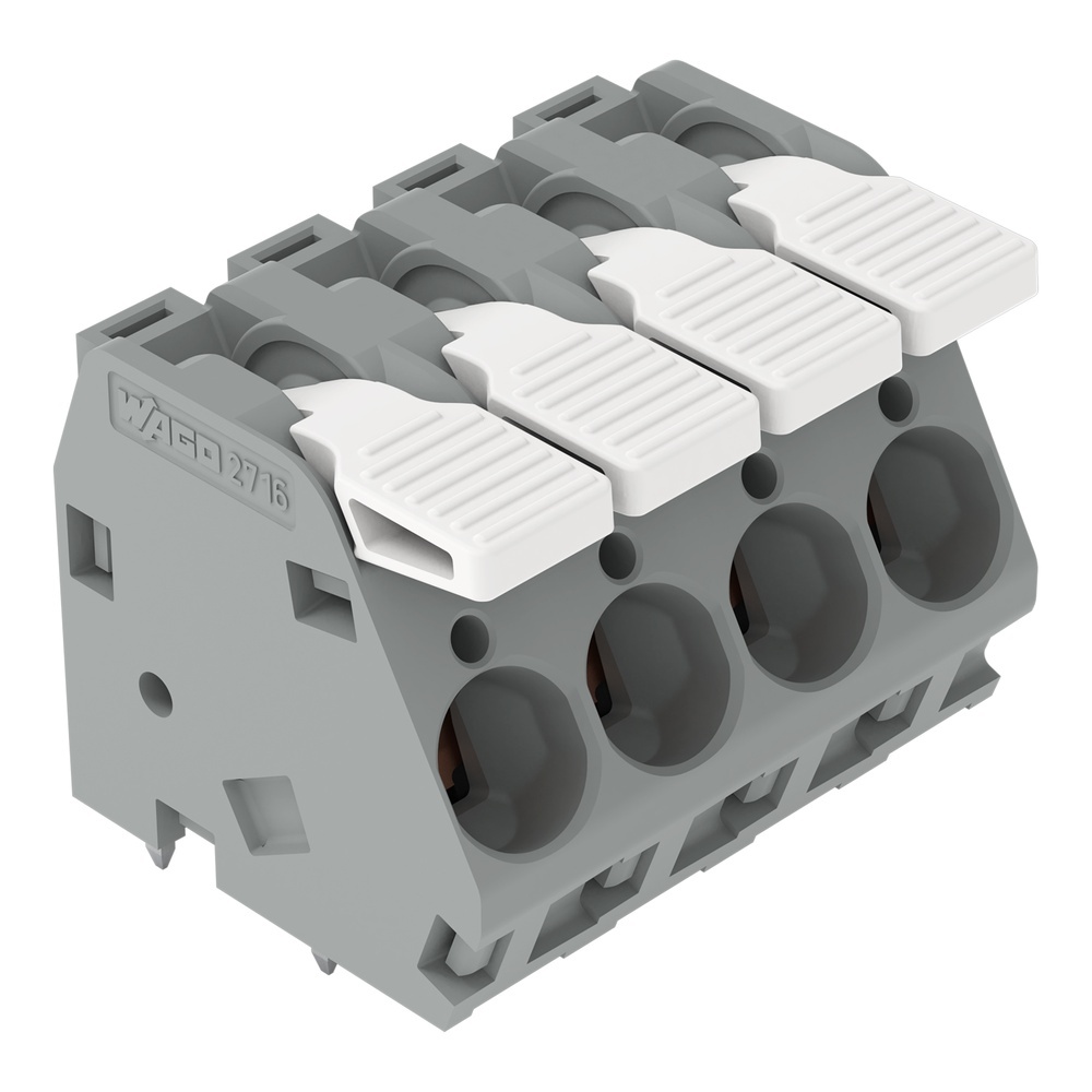 Wago Klemmenleiste 2716-105 Klemmenleiste mit Betätigungshebeln 4 Lötstifte/Pol 5-polig Rastermaß 10 mm/0.394 in ohne Brückerschacht grau Hersteller WAGO Serie 2716 EAN Nr. 4045454739294 Warengruppe WAGO Durchführungsklemmen