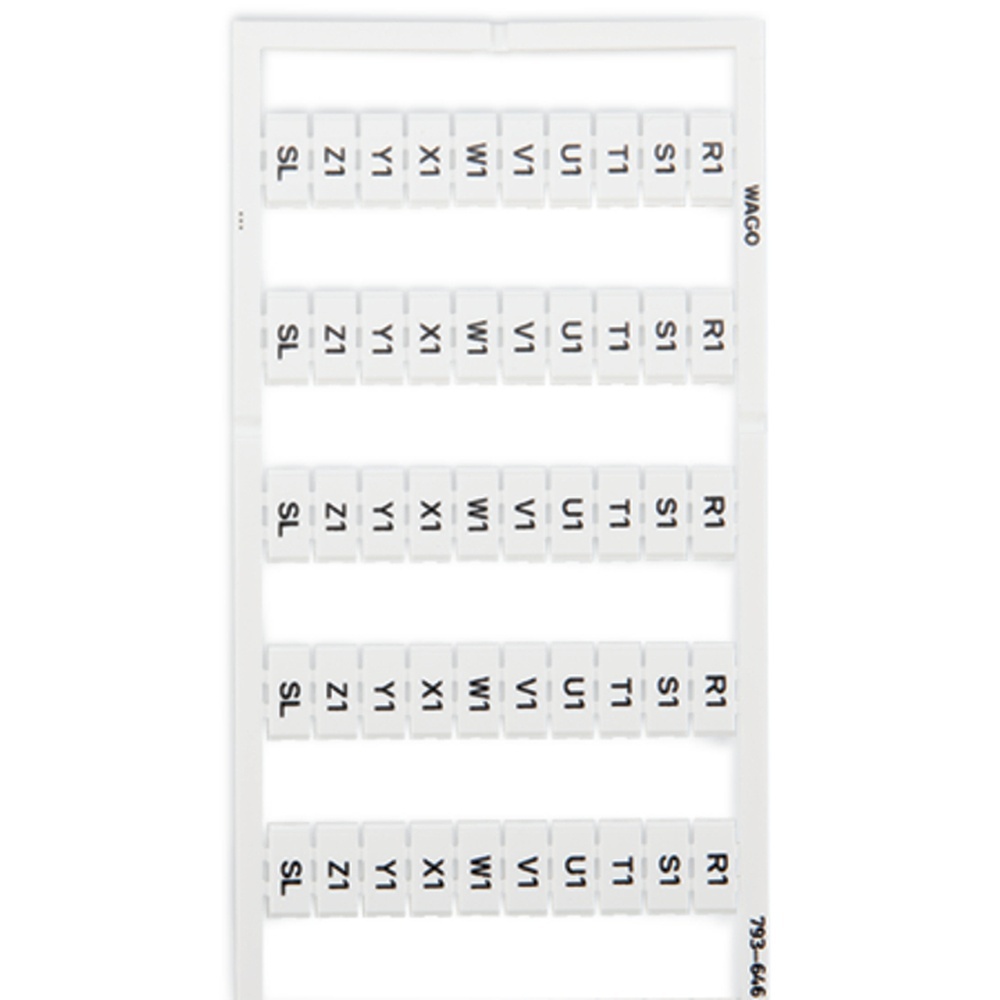 Wago Multibeschriftungssystem 793-646 WMB-Multibeschriftungssystem Aufdruck senkrecht R1, S1, T1, U1, V1, W1, X1, Y1, Z1,SL (10x) für Klemmenbreite 5-17,5 mm 10 Streifen à 10 Schilder pro Karte Gleichlautende Buchstaben/Symbole je Streifen weiß Wago Serie 793 EAN Nr. 4017332733632 Warengruppe WAGO Zubehör