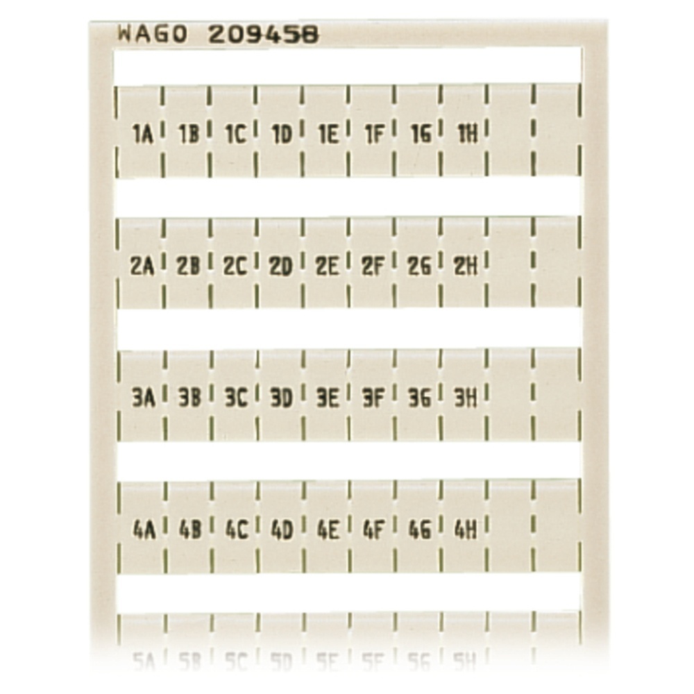 Wago Schnellbeschriftungssystem 209-458 WSB-Schnellbeschriftungssystem Aufdruck waagerecht 1A, 1B, ..., 1G, 1H, ... bis 10A, 10B, ..., 10G, 10H,, (je 1x) für Klemmenbreite 5-17,5 mm 10 Streifen à 10 Schilder pro Karte für Kraftwerksunterverteiler weiß Wago Serie 209 EAN Nr. 4017332097895 Warengruppe WAGO Zubehör