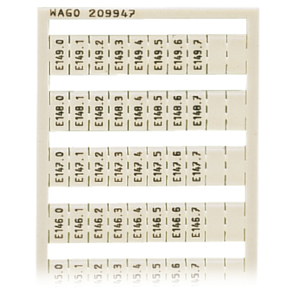 Wago Schnellbeschriftungssystem 209-947 WSB-Schnellbeschriftungssystem Aufdruck senkrecht E140.0, E140.1, ..., E149.6, E149.7 (je 1x) für SPS-Eingangskennzeichnung für Klemmenbreite 5-17,5 mm 10 Streifen à 10 Schilder pro Karte weiß Wago Serie 209 EAN Nr. 4017332101561 Warengruppe WAGO Zubehör