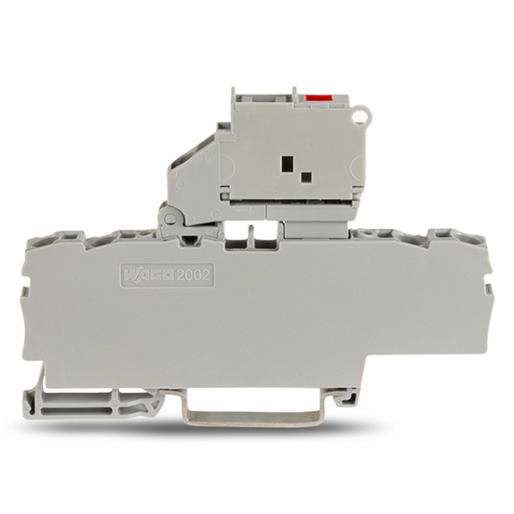 Wago Sicherungsklemme 2002-1811/1000-542 4-Leiter-Sicherungsklemme,mit schwenkbarem Sicherungshalter,mit Abschlussplatte,grau 4-Leiter-Sicherungsklemme, mit schwenkbarem Sicherungshalter, mit Abschlussplatte, für G-Sicherungseinsatz 5x20 mm, mit Defektanzeige durch LED, 30-65 V, für Tragschiene 35x15 und 35x7,5, 2,5 mm², Push-in CAGE CLAMP , 2,50 mm², grau Hersteller Wago Nr. 200218111000542 EAN Nr. 4066966335590 Warengruppe WAGO Reihenklemmen