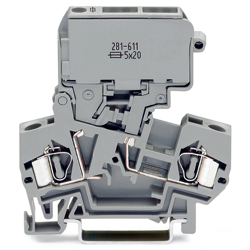 Wago Sicherungsklemme 281-622 Sicherungsklemme mit schwenkbarem Sicherungshalter für G-Sicherungseinsatz 5x30 mm ohne Defektanzeige grau Wago Serie 281 EAN Nr. 4045454871550 Warengruppe WAGO Reihenklemmen