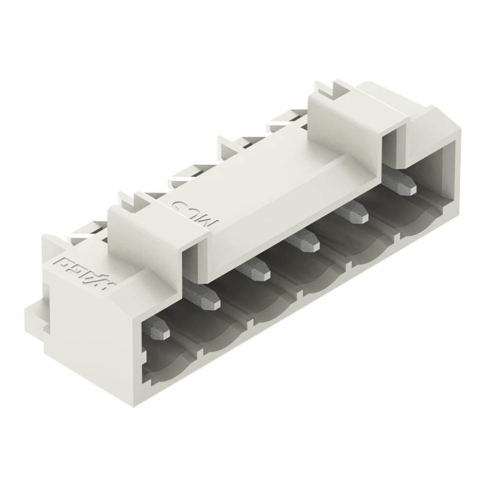 Wago Stiftleiste 721-466/001-000 Stiftleiste mit abgewinkelten Lötstiften 1,2x1,2 mm 6-polig Rastermaß 5 mm/0.197 in 100 % fehlsteckgeschützt ohne voreilenden PE-Kontakt mit Seitenwänden Steckrichtung parallel zur Leiterplatte lichtgrau Wago Serie 721 EAN Nr. 4044918933223 Warengruppe WAGO Multistecksystem